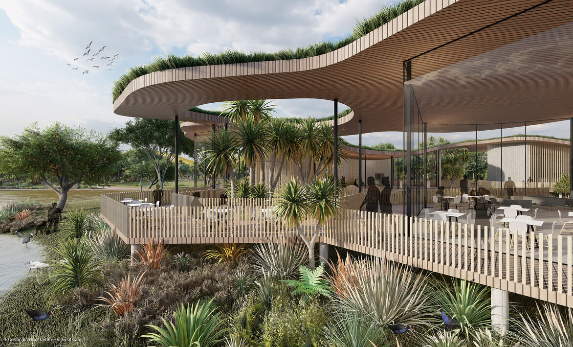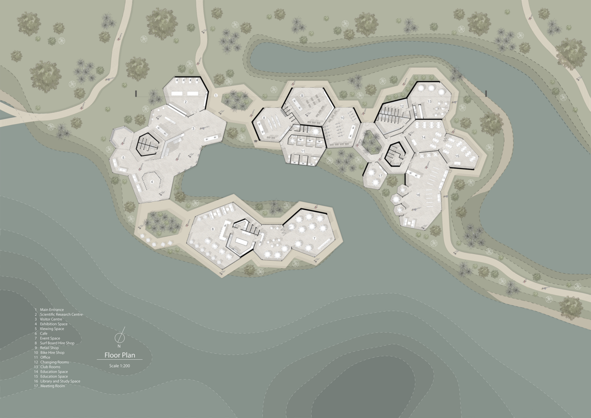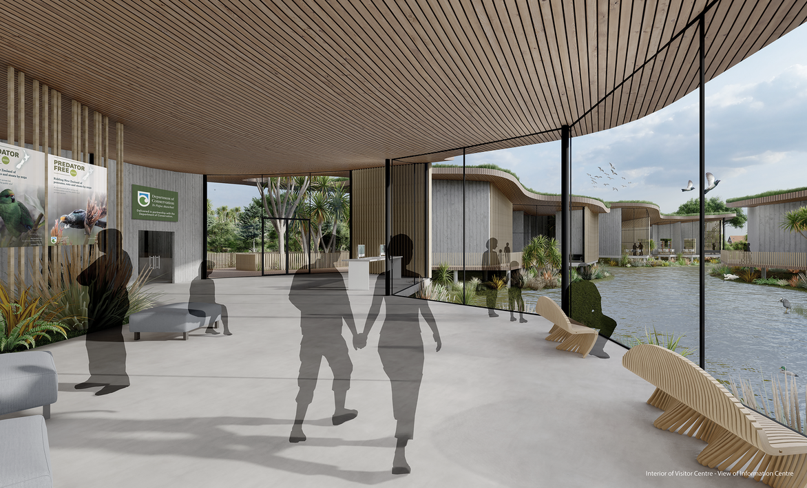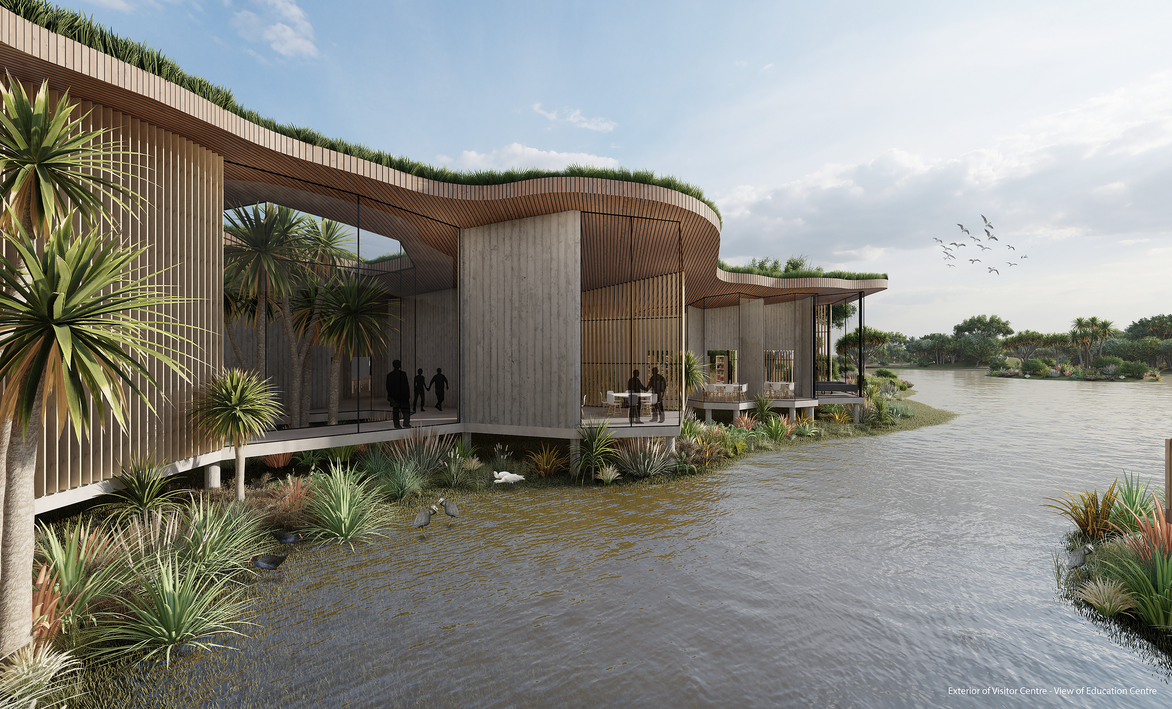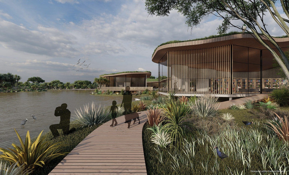 Immersed within the wetland, the visitor center focuses on adaptability, community, and a sustainable ecological response. The design creates focus for a marginalized suburb, with an information centre, research centre, business hub and educational facilities. Derived from the idea of a living eco system, the fluid form mimics the soft, organic landscape of Kaituna, while the green roof and use of natural materials seamlessly blend into the intricate patterns and textures of living things.