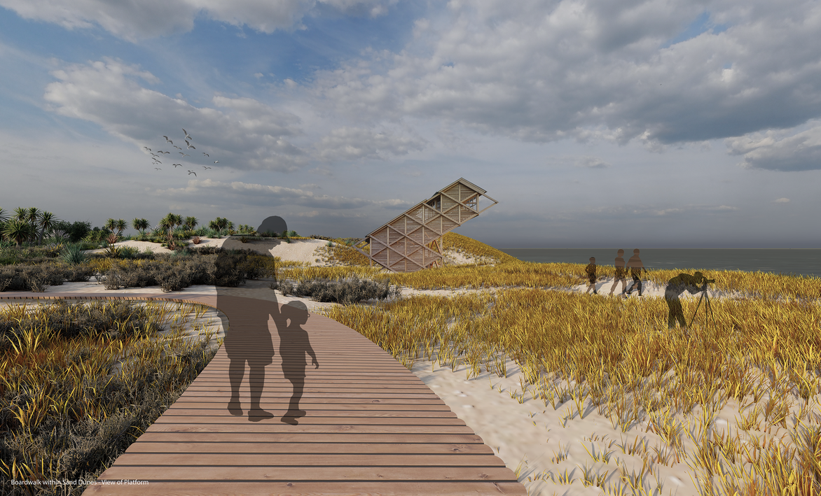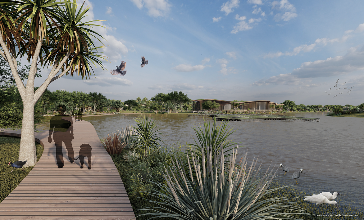 The design centres around a man-made wetland and sand dune environment, that imitates the function and aesthetic of the original Kaituna landscape. With various habitats, walkways and viewpoints, the new landscape reduces surface flooding, promotes wildlife, and uplifts the spirit on the visitor.