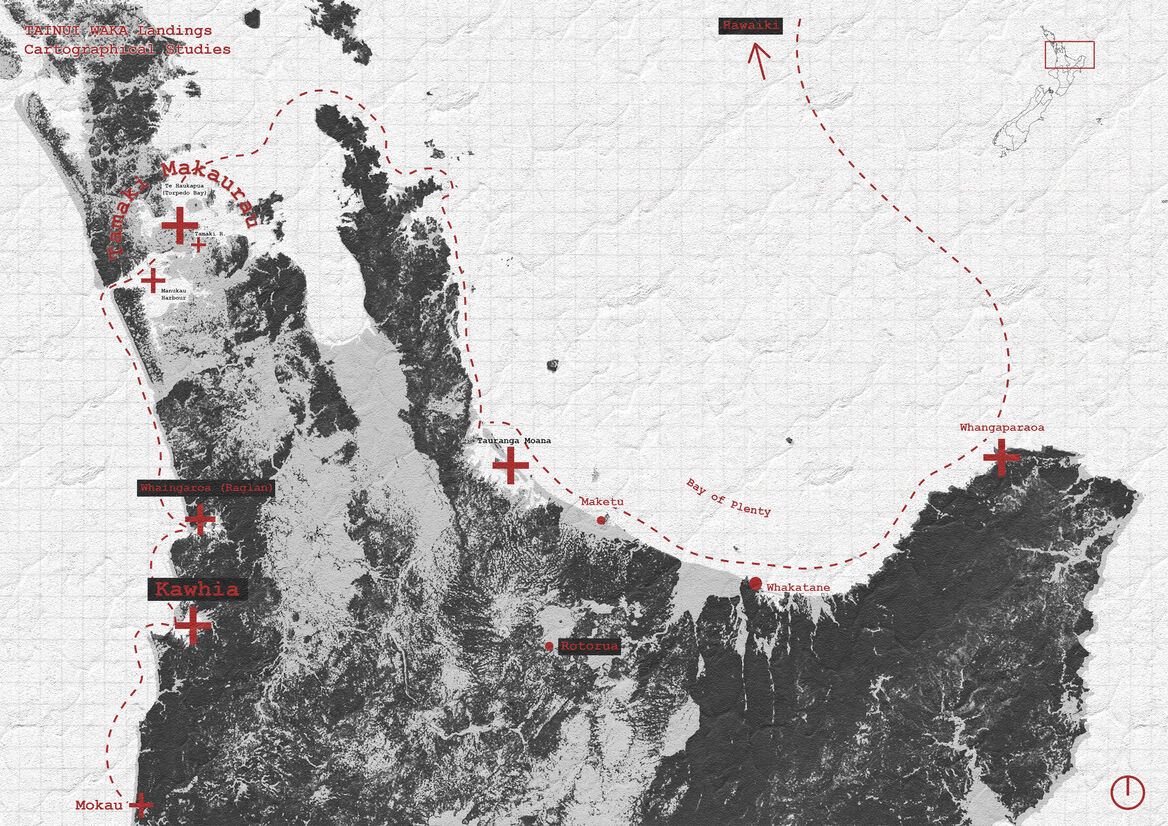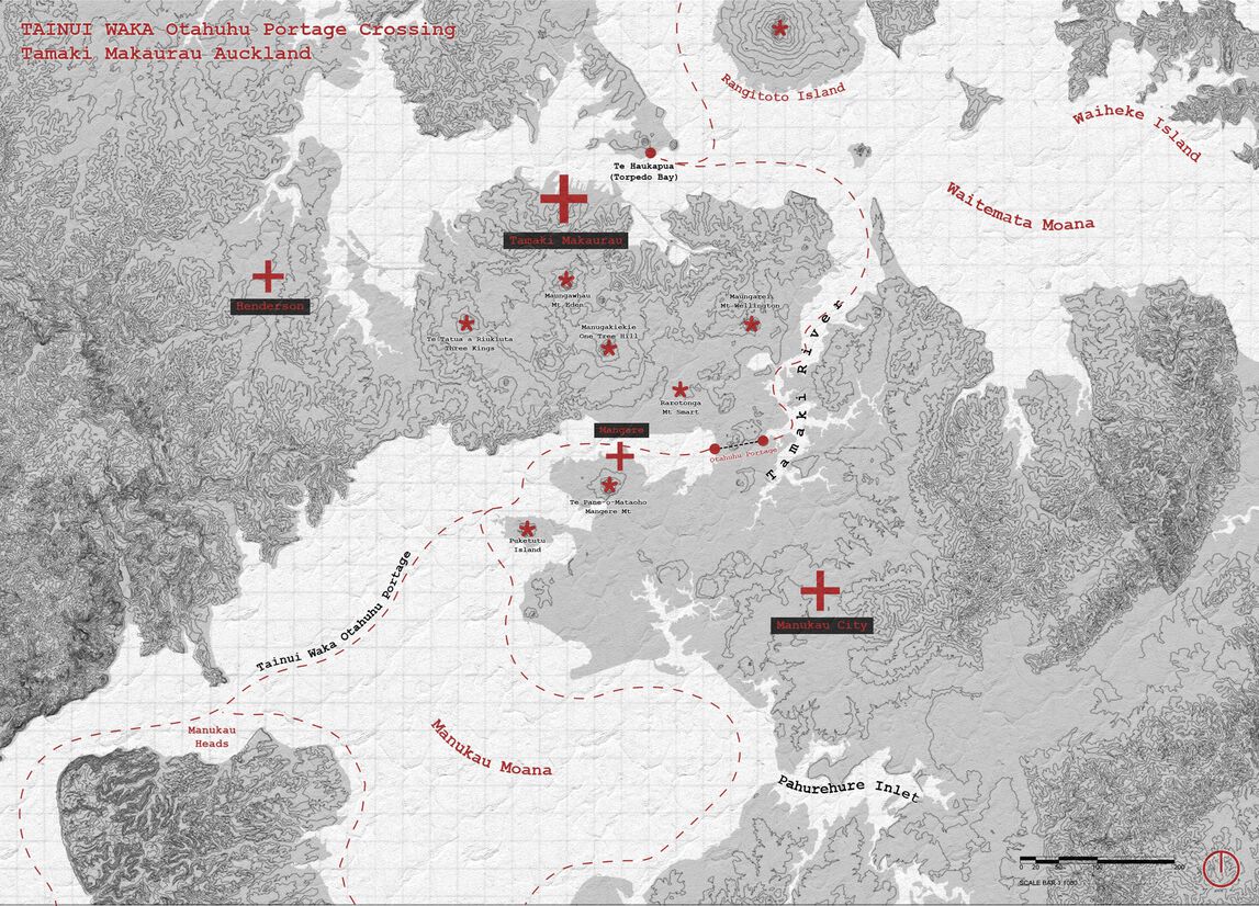 Hape and his journey upon the Tainui Waka, from greater Hawakiwi to the North Island of Aotearoa, provided much inspiration for this project. Mapping out their voyage along the way in an attempt to illustrate the symbolic value of voyaging through traditional methods. The Tainui's journey throughout Tamaki Makaurau, was challenged by the crossing of the Otahuhu Portage. Upon which the waka was lifted out of the Tamaki River (the Waitemata side) and carried across the thin strip of land that separates the two bodies of water into the nearby Manukau Moana.