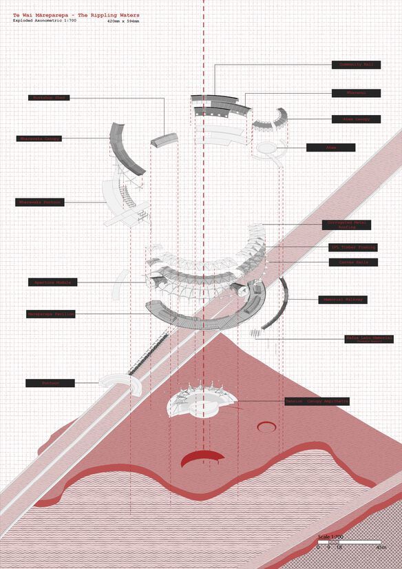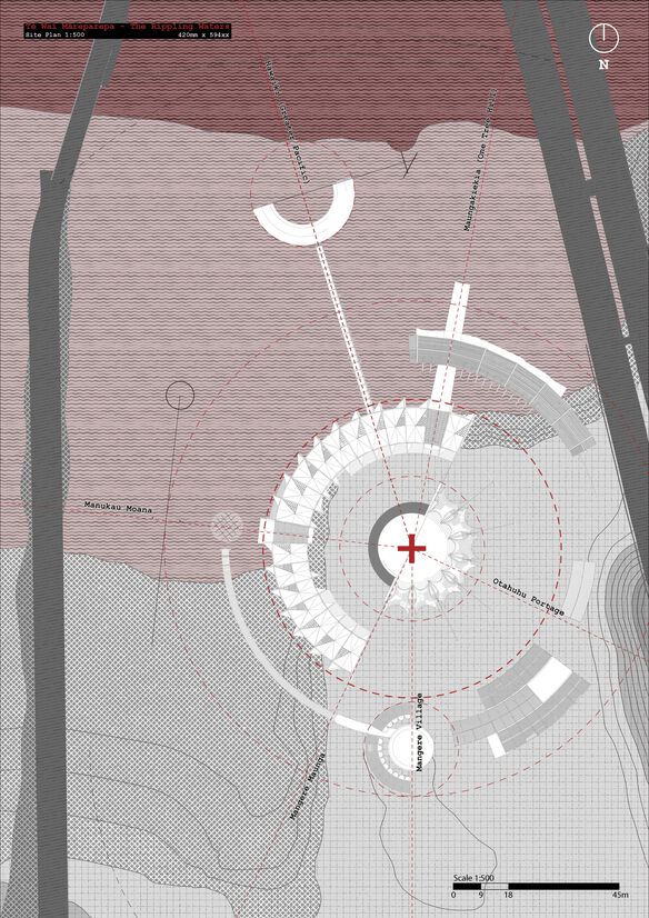 Translating these themes, the collection of various structures and their associated programs are articulated in the form of a navigational instrument. Te Kapehu Whetū (The Maori Star Compass), transposing the compass onto the site, extruding volumes and extending reference lines to create the architecture. Resulting in offsetting radial forms that develop outwards from the centre of the site, with strong axes and apertures interesting the forms, suggesting direction, motion, growth or extension.