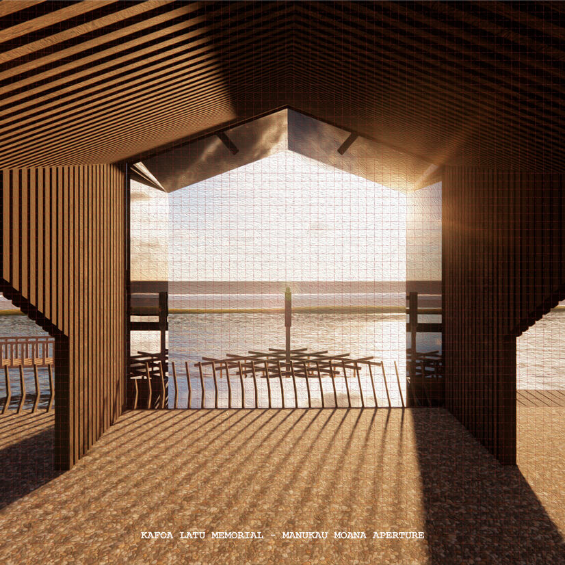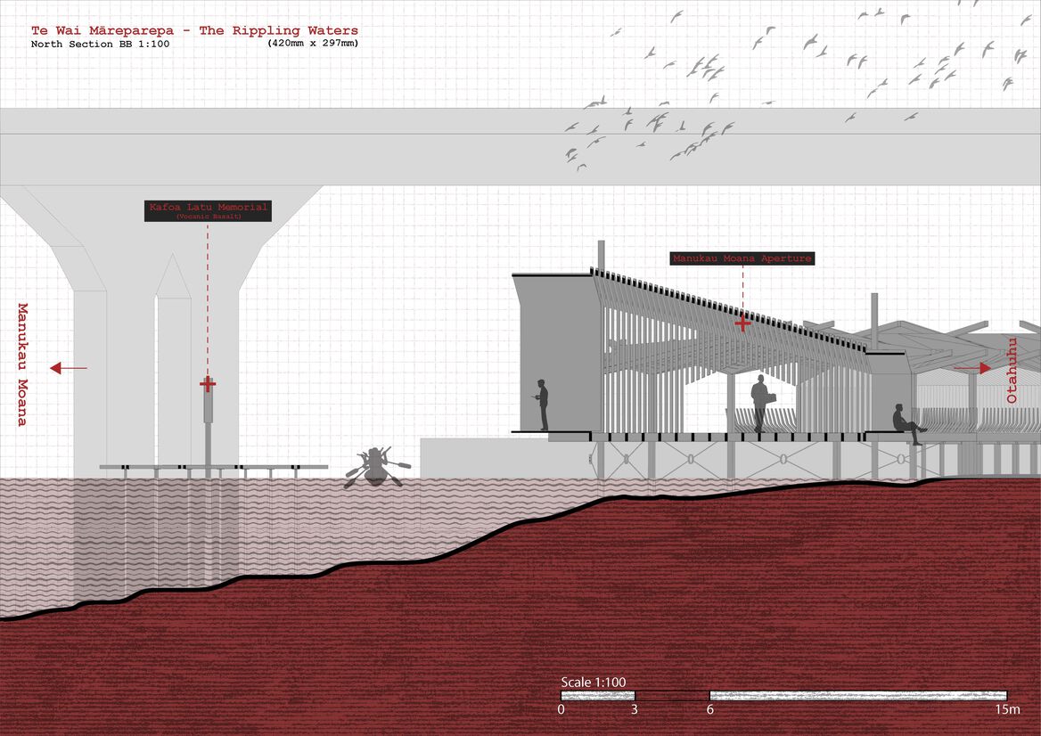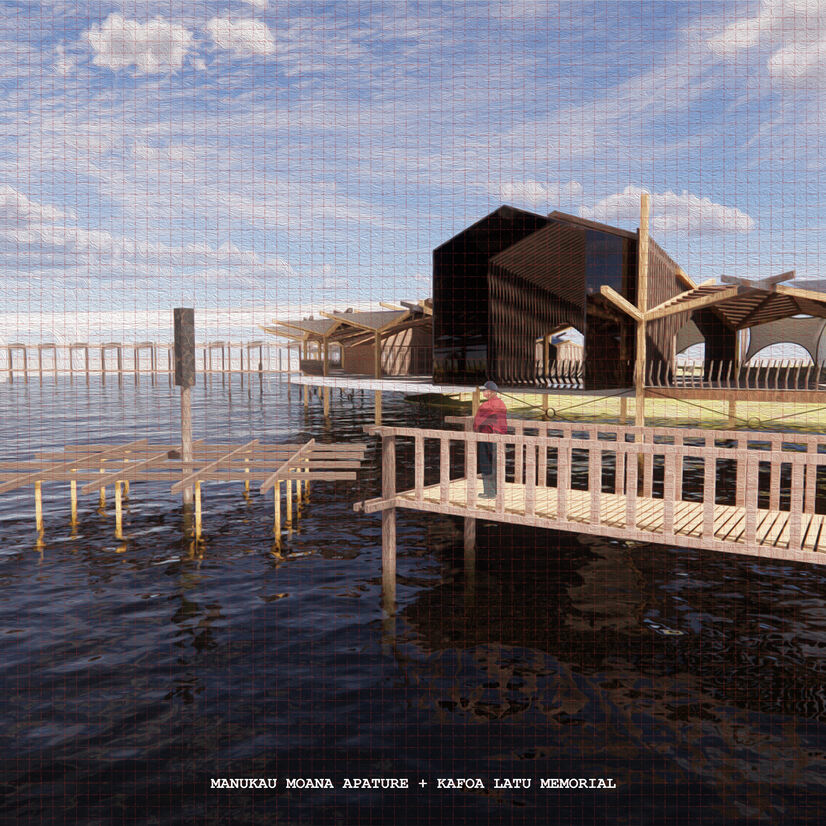 (In this real-life project, the Portage Club requested the inclusion of a memorial to the late Kafoa Latu. A prolific member of the club, Mangere and the greater South Auckland community, Kafoa touched the lives of many, leaving behind a legacy that will be forever remembered. Much like the historic stonefelids of Ihumātao, Kafoa has been immortalised through stone, returning back to the land. Articulated through volcanic basalt and lightly resting atop a totem out on the water, The memorial is centred with the Manukau Moana aperture, returning to the water, acting as a place for the greater Pacifica community to come and pay their respects.)