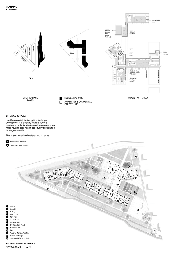 Kūwaha aims to be more than a housing project—it is a spatial and social framework designed to support the changing demographic and cultural fabric of Whakatāne. What elevates this work is its capacity to scaffold a more regenerative, inclusive, and context-specific form of regional urban growth, offering more than a solution to housing, but a long-term structure for community resilience.