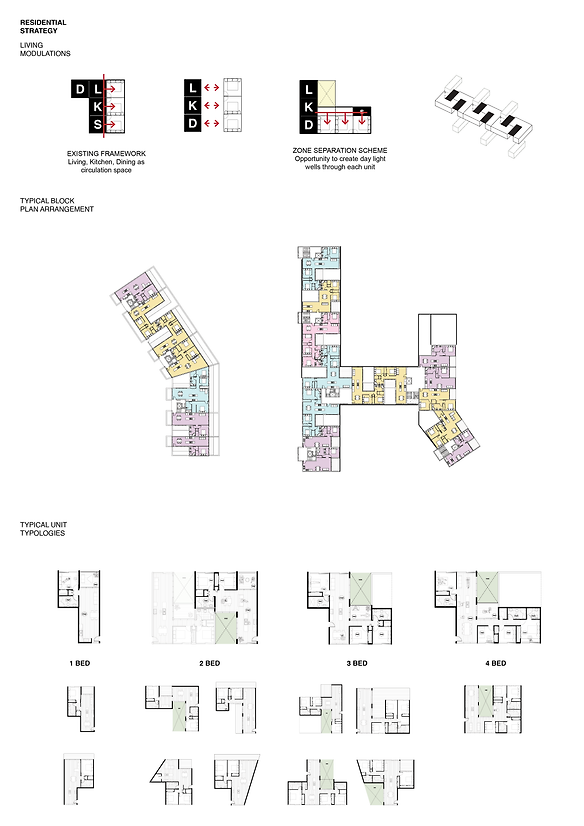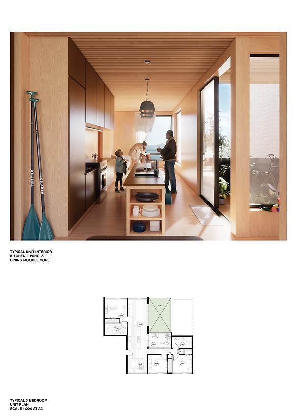 This residential design of component challenges conventional open-plan apartment layouts by establishing a clear spatial hierarchy between communal and private areas. Influenced by Māori concepts of tapu (sacred) and noa (common), a daylight well separates the vertical living core from the horizontally branching bedroom wings. As the number of bedrooms increases, these wings extend laterally while preserving the core structure, ensuring all spaces receive natural light and ventilation. The modular configuration of the 71 units allows for tessellating efficiently, enabling scalable and cohesive block volumes.