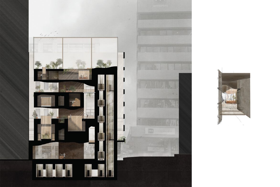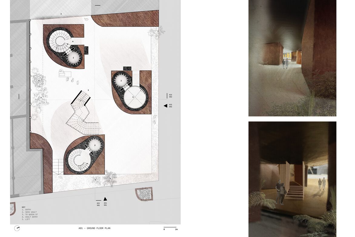 Replacing the existing imperial stronghold of the South British Insurance building, a seed vault and a gallery of earth-themed spaces embody the principles of static and dynamic: the vault is an impenetrable and enduring environmental safeguard, while the gallery is a dynamic sequence of visceral experiences aimed at reconnecting the public with the ground beneath their feet.