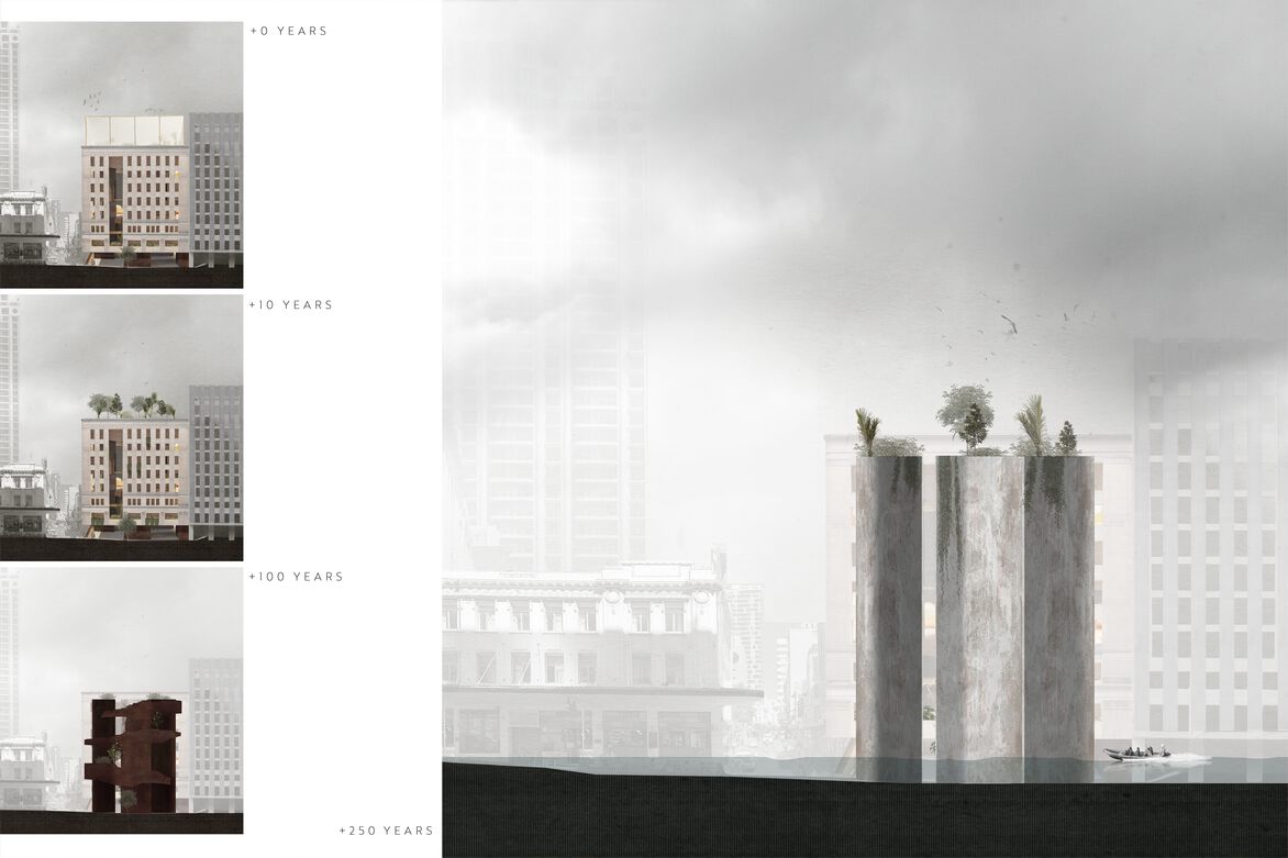 A timely exploration of the temporal and fragile nature of our cities, and how architecture could (and should) reconnect us to both the passage of time and the natural environmental. The renders are evocative, atmospheric, and very effective at telling this compelling story of a building built (and adapted) for an uncertain future.