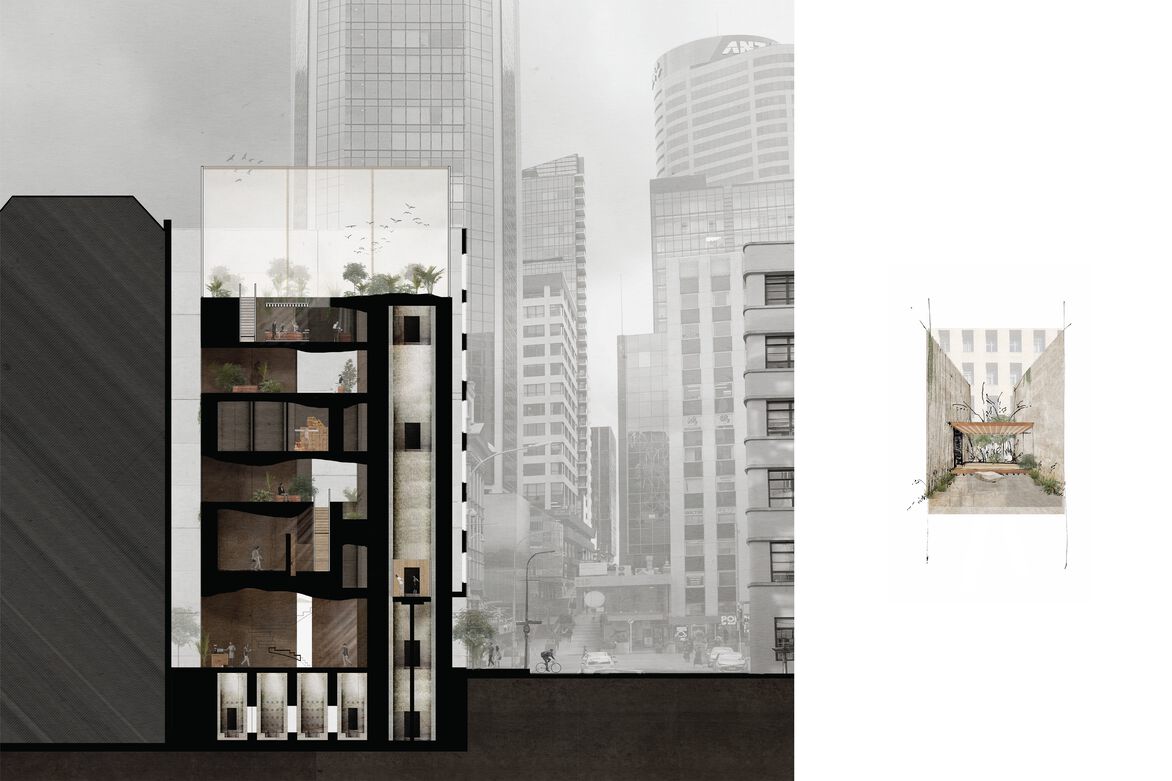 Over the past two hundred years, the corner of Shortland and High street has borne witness to four iterations of building - each larger and less connected to the earth than the previous. Our feet are now separated from the ground of the city by a plane of concrete and steel: our perception of time is warped by the static nature of our buildings. This project seeks to reconnect people and the earth in the city, by rejecting the ‘finished’ urban model and employing the ever-evolving dynamism of the natural world, which can be simplified into two systems of space: ‘static’ like the ground, and ‘dynamic’ like the surface environment.