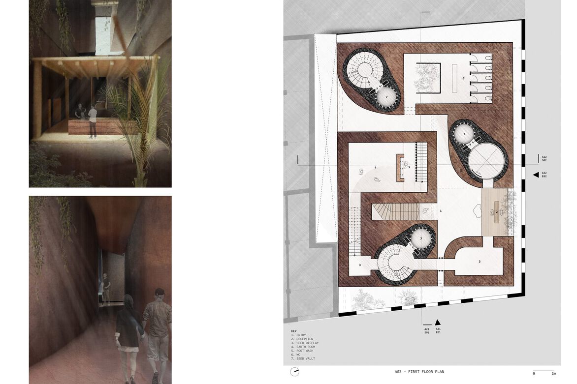 The building operates at three time scales: the transient, the long-term, and the permanent. Three megastructure concrete cores house an array of seed vaults - each core has its own stair or lift, operating independently above ground level, linked by the basement level. They are designed to withstand the tests of time and climate, safeguarding our ecology, with a lifespan of several hundred years. Around these sit three poured earth boxes, carved and crafted to create gallery and garden spaces. They are designed to weather and deteriorate, with a shorter lifespan than the cores - ultimately resulting in the decay of the gallery as it returns to the ground, leaving only the seed vaults standing. Transient timber and fabric structures are plugged into the earthen volumes to serve and adapt to the immediate needs of the building, allowing the scheme to achieve and sustain relevance throughout time.