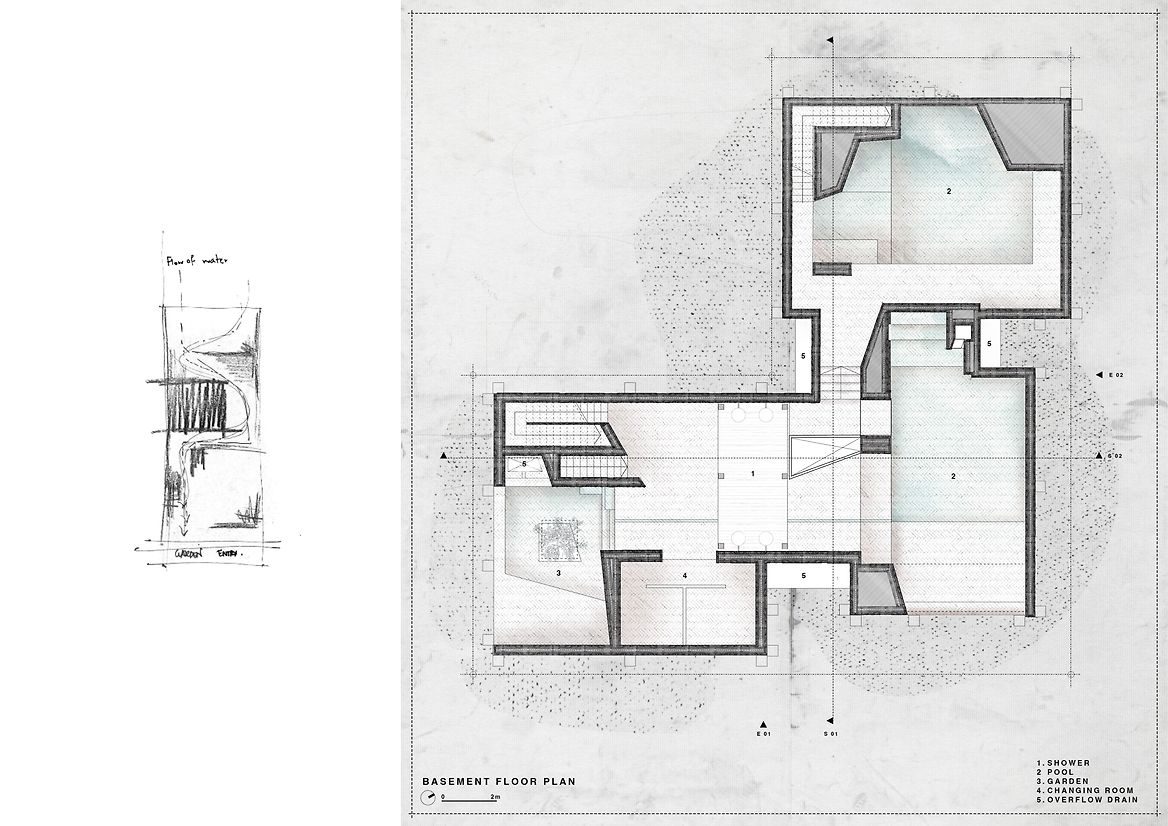 The architecture diverges from traditional attitudes towards water in buildings, welcoming it rather than feverishly seeking to repel it. The proposal is equally as focused on the movement and occupation of water as it is the movement and occupation of people - three programmes intertwine in the bounds of the building: water reservoir, bathhouse and workspace. In a way, these three activities work as a continuum rather than as discrete events.