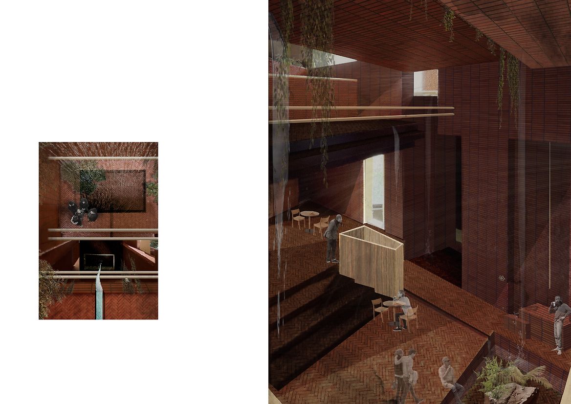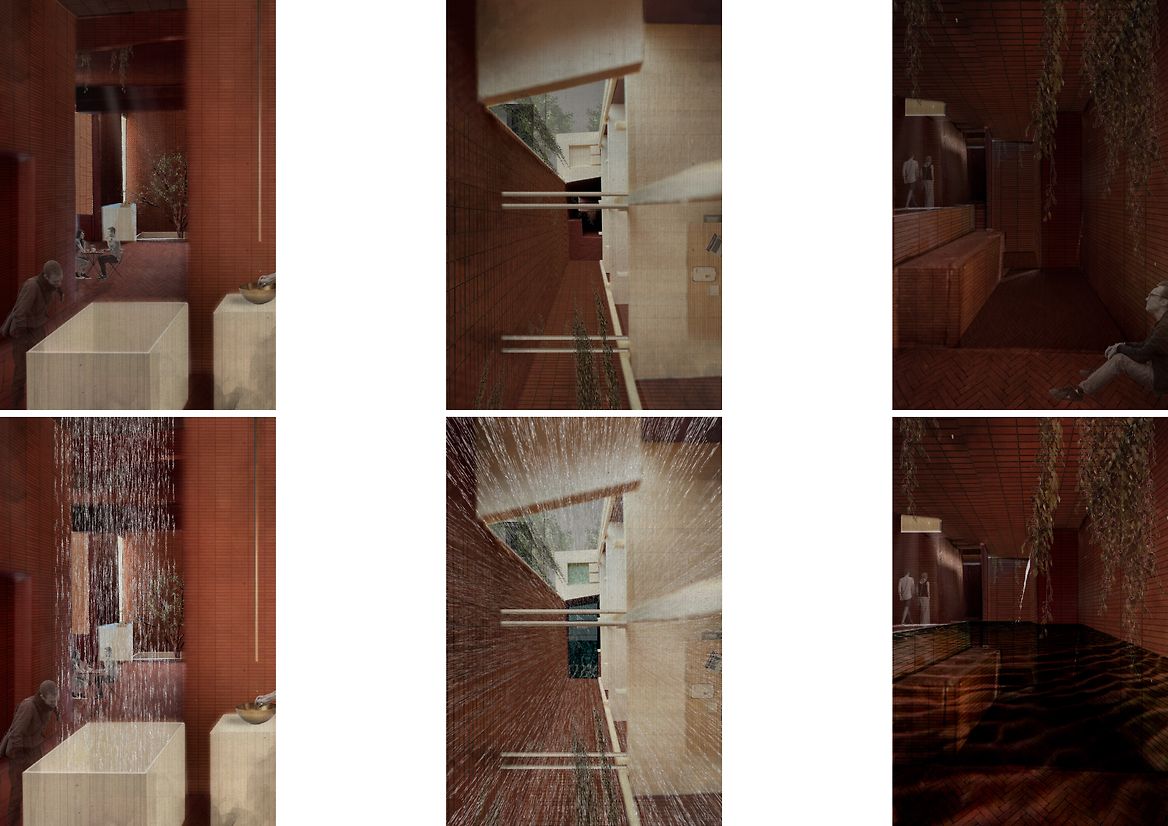 The spatial arrangement emphasises compression and expansion, giving legibility to the public-private and corporate-recreational divides. Visual intricacy is introduced in the form of steps, however these are far from ornamental: each shift provides an opportunity to measure the water level, and to discern the average levels through the weathering and staining of the surfaces.This strategy lays bare both the presence and absence of water. In times of flood, the water is unavoidable as it runs down walls and submerges non-critical pathways. In times of drought, the memory of the water in the empty channels and pools is equally poignant. The availability of water impacts the ability of the occupants to easily bathe, drink, and circulate in the building. It also influences the health of the network of gardens, which act as a visual indicator of the state of the climate. Simple volumes emphasise the weathering of the materials: in the absence of clutter, it is easy for the building's message to be understood.
