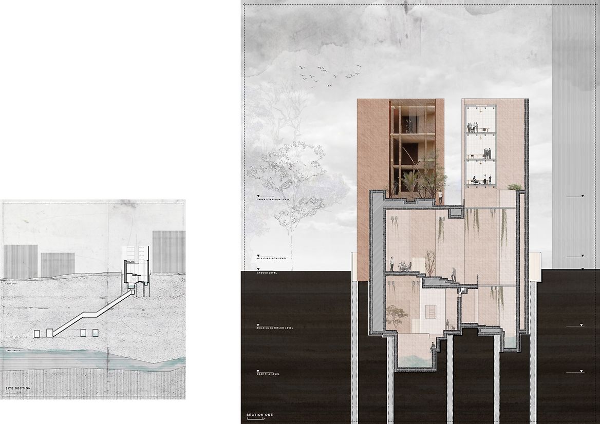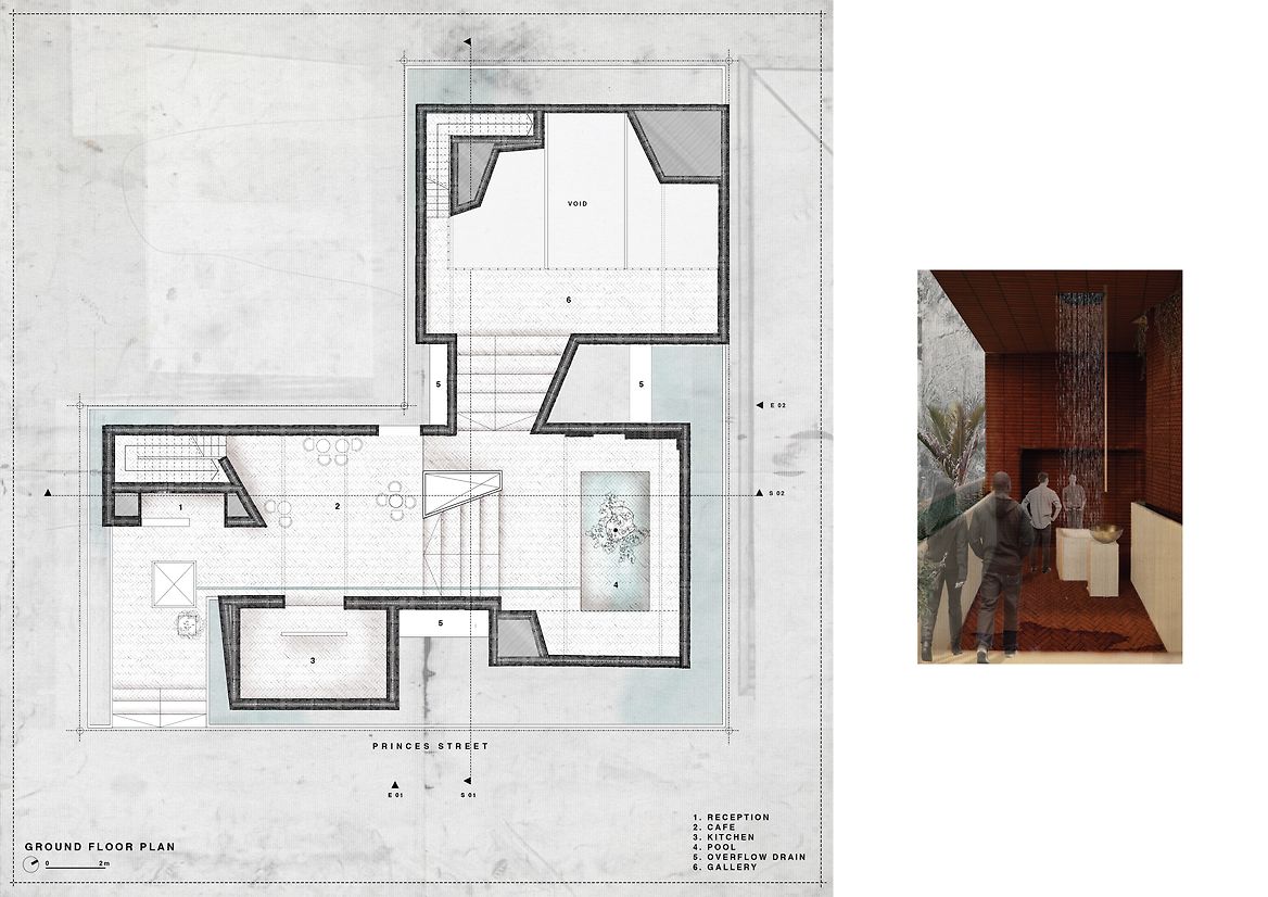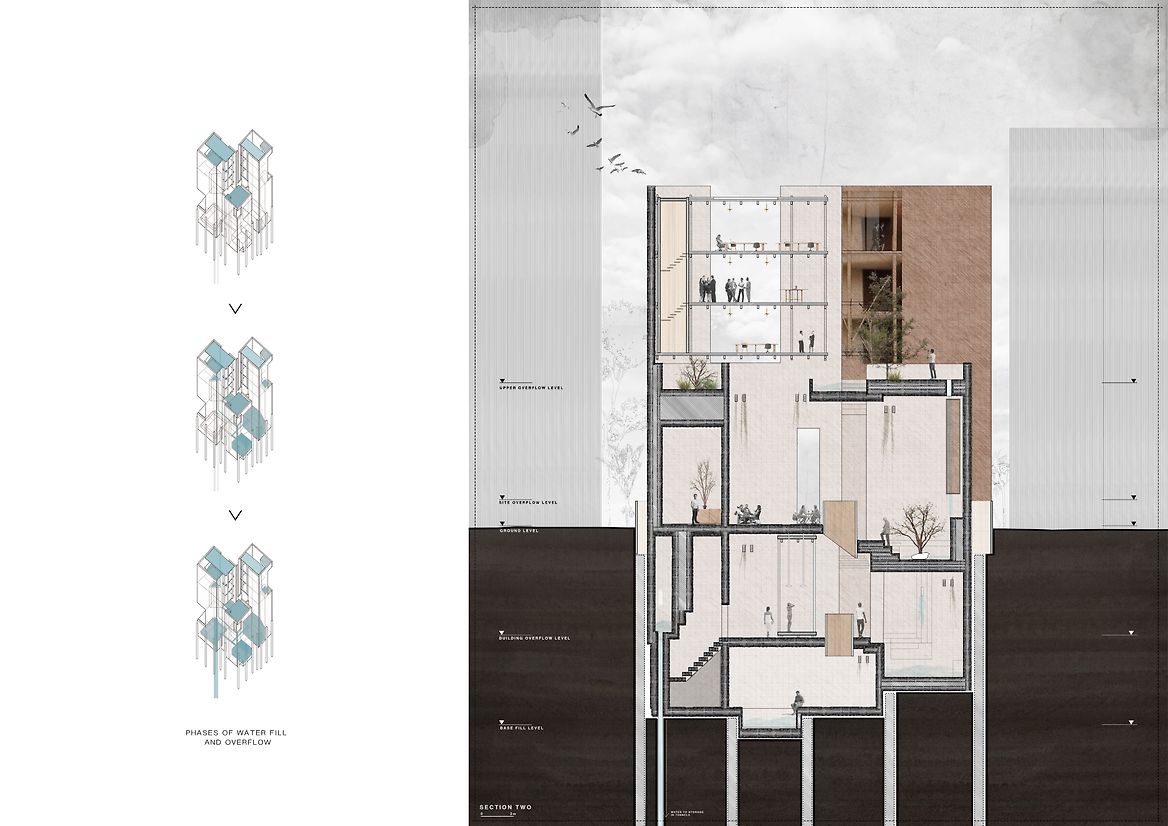 Formed in the context of recent extreme water events throughout Aotearoa - drought and flood in equal measure - this project asks how architecture can adapt to the availability of water. It explores the relationship between water, people, and the built environment through the lens of climate change, imagining a building as a vessel for water rather than a closed dry cell. With this philosophy, it aims to amplify climate awareness amongst occupants and passers-by.