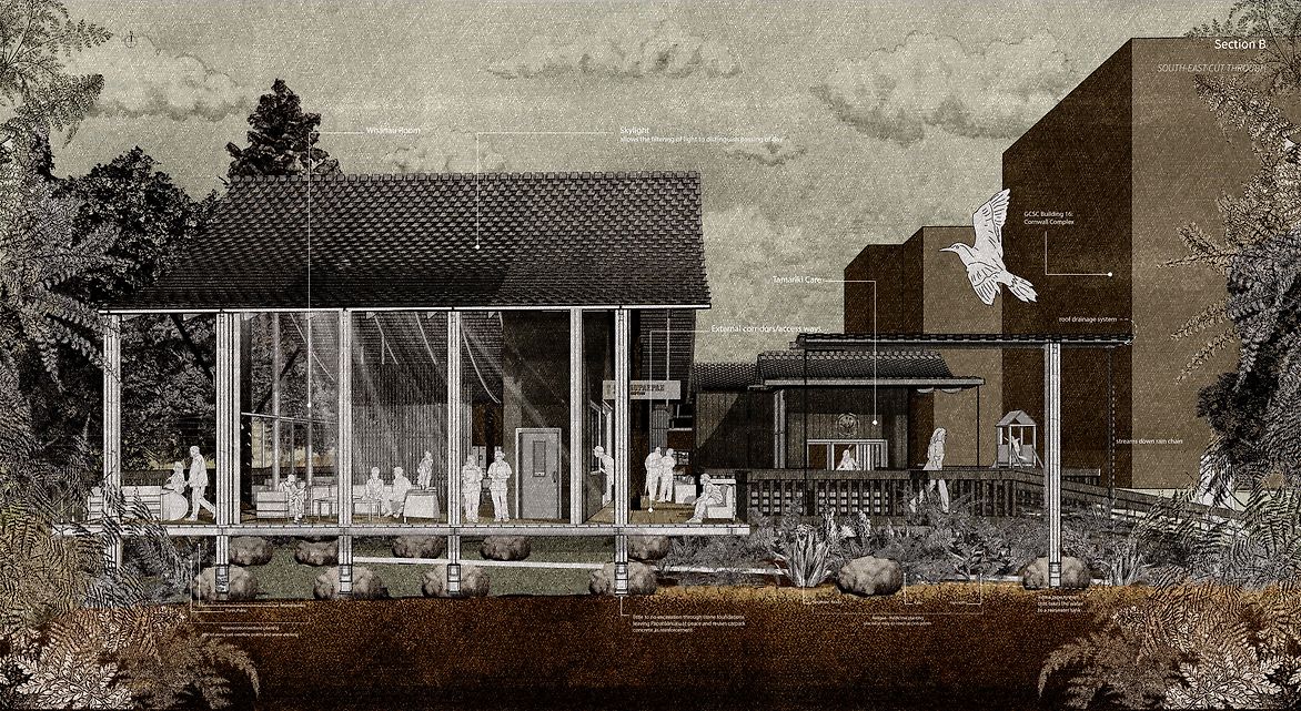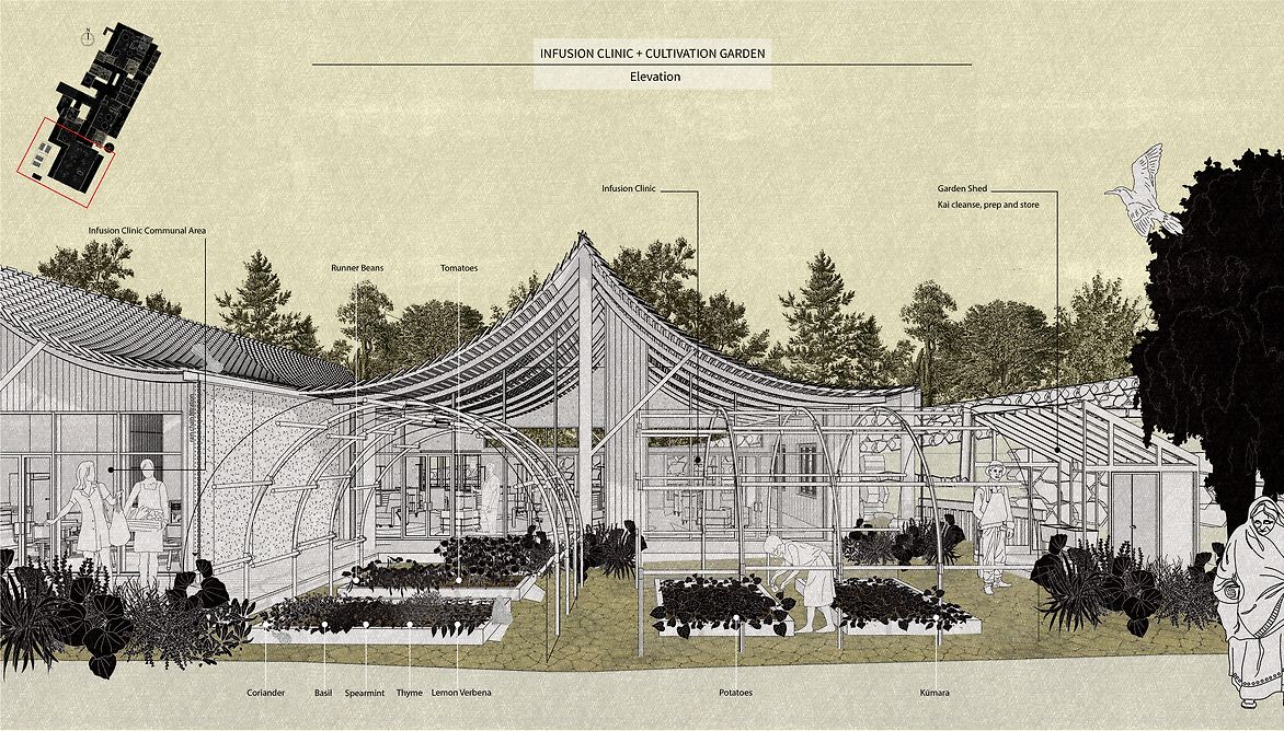 This research closely discusses Māori holistic health approaches and the disparities in healthcare and highlights deep health imbalances between Māori and non-Māori populations and the need for holistic Indigenous health approaches. The thesis focuses on re-indigenising healthcare at the Greenlane Clinical Service Centre in central Tāmaki-makau-rau, proposing an infusion/wellbeing centre as a proof-of-concept. The study addresses how this approach can connect Indigenous knowledge systems with urban development by incorporating sustainist design principles, which were introduced by academics Michiel Schwarz and Diana Krabbendam as principles that connect social and ecological sustainability, that strategise sustainable innovation and social design to improve Māori health services and well-being while celebrating cultural significance.