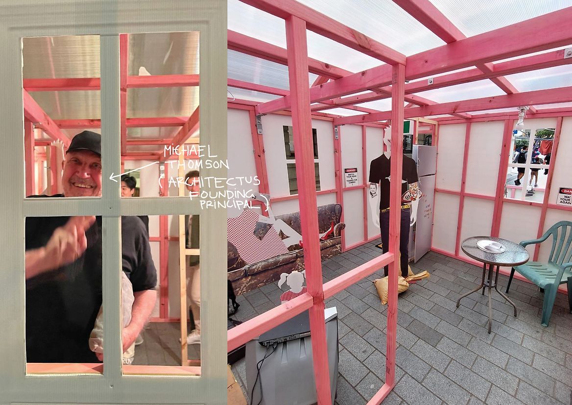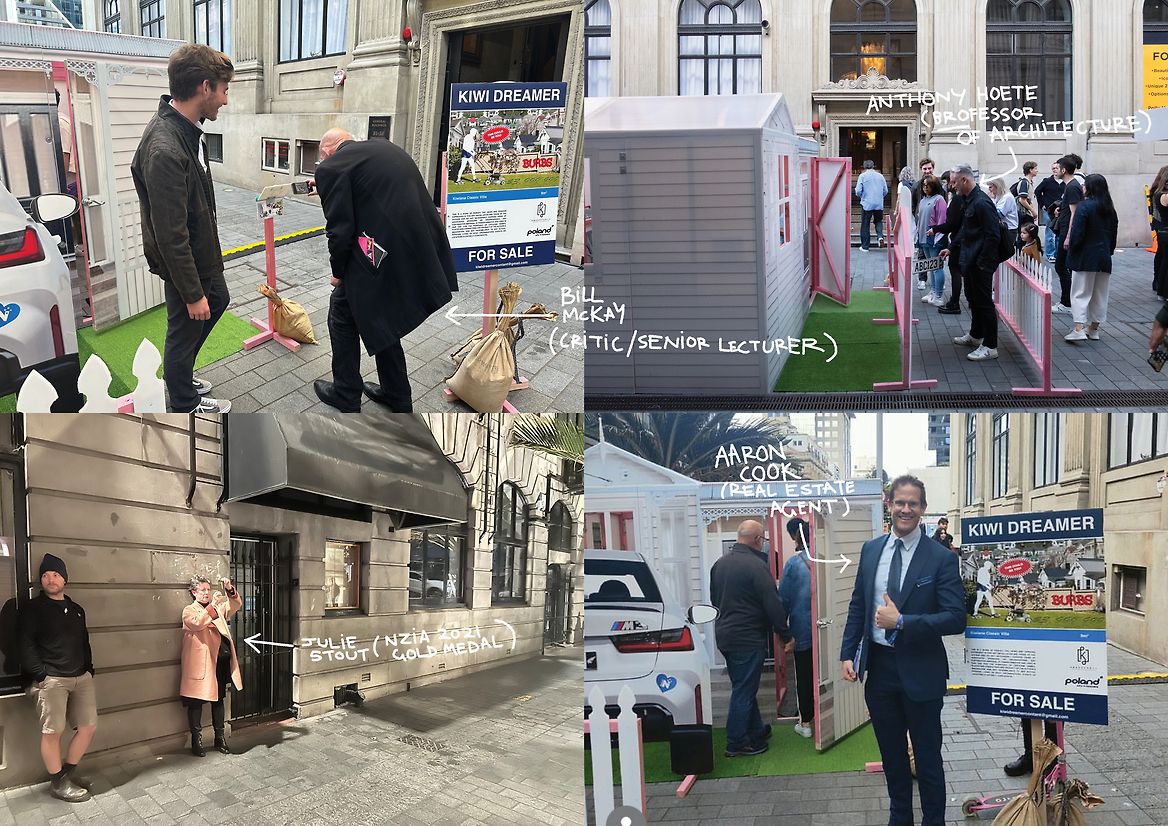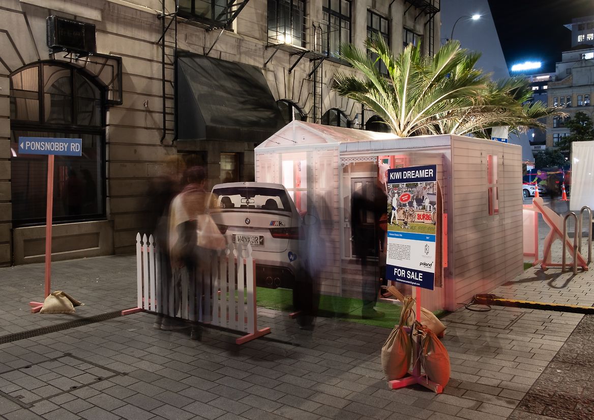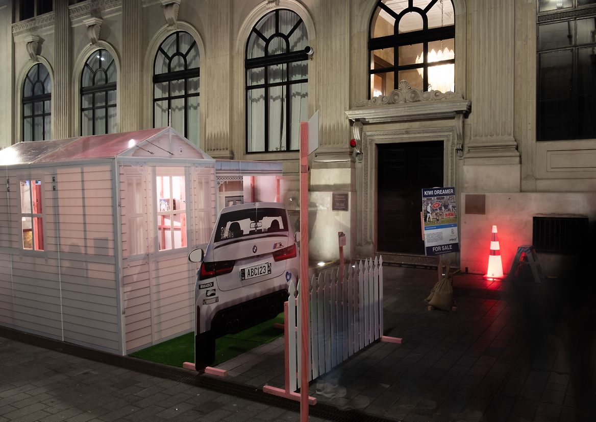 The complete cost of the 3x3 metre project was around 1000 bucks of Heart of the City’s allocated funds, most of which was blown on the large format printing, while the timber was supplied by a team member’s contractor friend via begging. The various other miscellaneous objects, materials and doohickeys were sourced from second-hand sources... my Mum's tool shed, the side of the road, TradeMe and, of course, Facebook Marketplace — oh, how I love you. This is the Kiwi Dreamer, the Kiwi Schemer, the Kiwi Ain’t All It Seems-er and the Kiwi Believer: a 3x3 metre villa reproduction constructed with 90x45 pink timber to make a larger-than-life doll house, all cloaked in an election campaign like signage skin.
