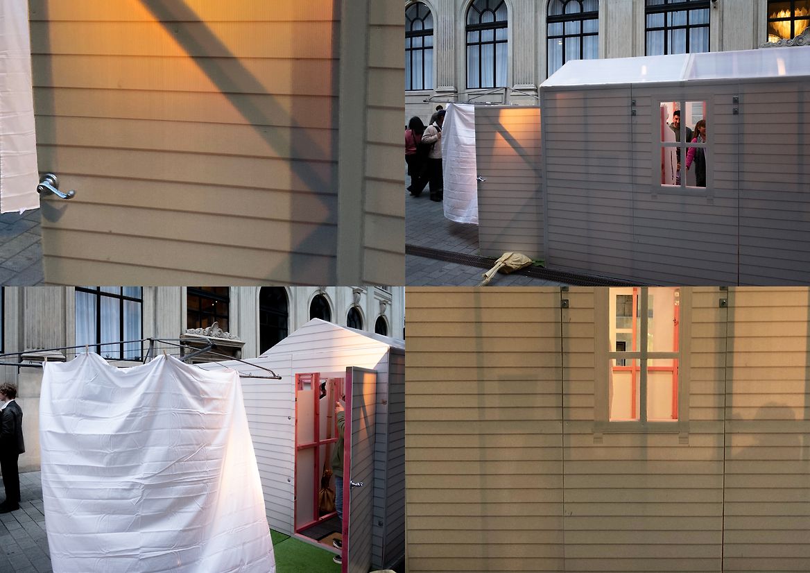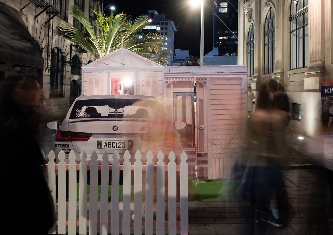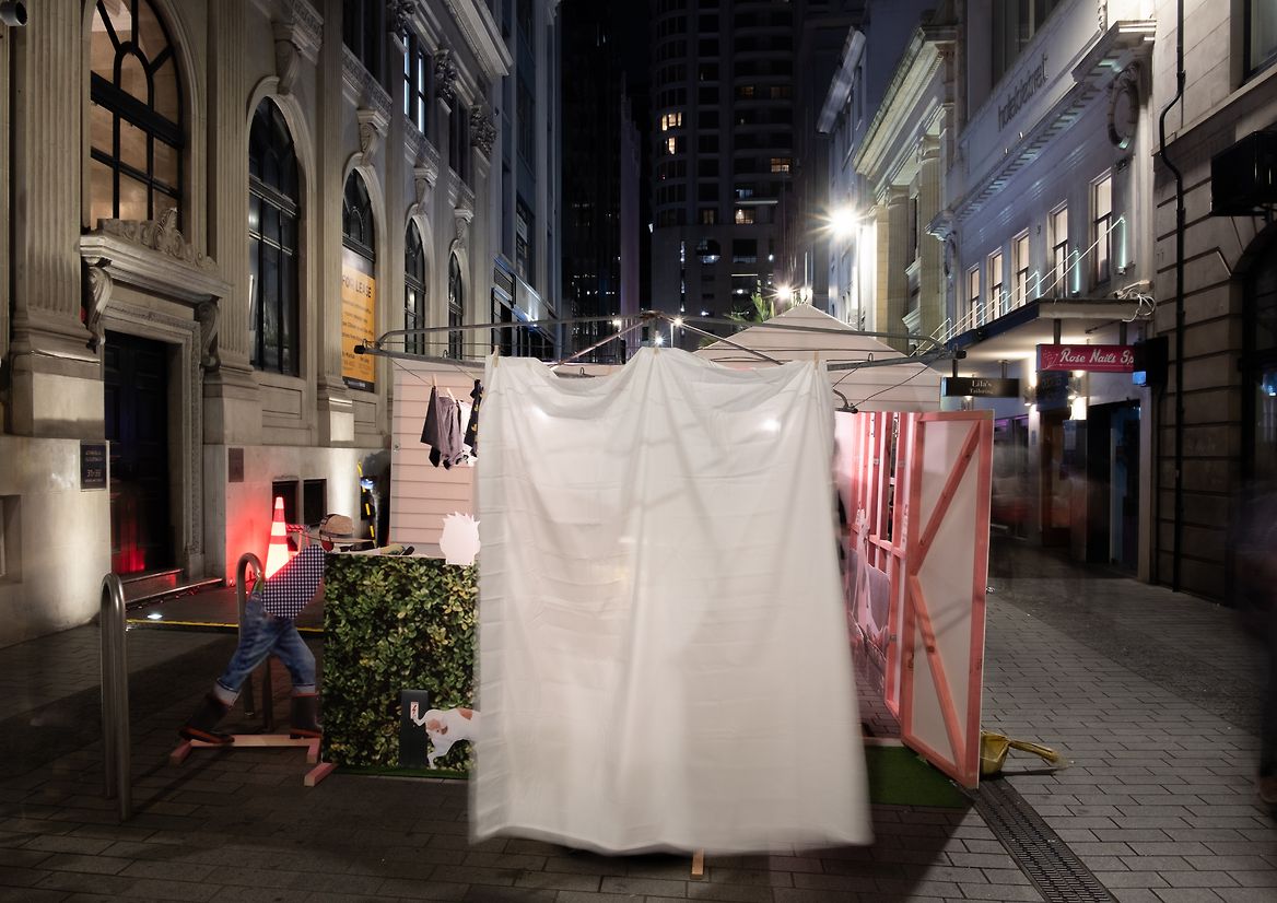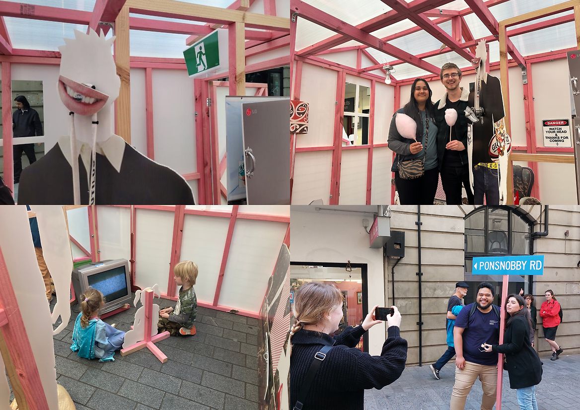The complete cost of the 3x3 metre project was around 1000 bucks of Heart of the City’s allocated funds, most of which was blown on the large format printing, while the timber was supplied by a team member’s contractor friend via begging. The various other miscellaneous objects, materials and doohickeys were sourced from second-hand sources... my Mum's tool shed, the side of the road, TradeMe and, of course, Facebook Marketplace — oh, how I love you. This is the Kiwi Dreamer, the Kiwi Schemer, the Kiwi Ain’t All It Seems-er and the Kiwi Believer: a 3x3 metre villa reproduction constructed with 90x45 pink timber to make a larger-than-life doll house, all cloaked in an election campaign like signage skin.