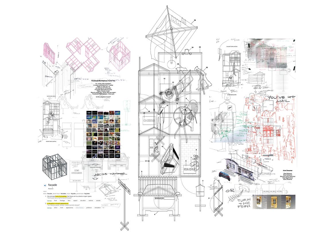 Here in Aotearoa, New Zealand, we are fixated on owning a detached family home on a quarter-acre section. This is what New Zealanders have interchangeably dubbed the “New Zealand dream” or the more patriotic version: the “Kiwi dream”. The Kiwi Dreamer is a response to the nightmare reality of this dream. Disguised by a series of propped cardboard-cut-out-like elevations, like a Potemkin house, the collage appliquéd home “puts on a façade”, both in the architectural sense and the cliché. The front, sides and rear display a picturesque Ponsonby villa with a picket fence, dainty mailbox, manicured hedge, and an egotistical beamer (BMW) parked out front. However, when investigated closer, the components are tactile, meaning that the public uncovers the truth of the so-called “Kiwi dream” and the lifestyle that supposedly tags along with it. An accompanying looping video blasting through a Y2K dated television compiled a history of Aotearoa, New Zealand’s strange postcolonial identity in all its idiosyncrasies and idiocies. Onlookers described the installation in varying levels of disgust or praise, from “Mum, it’s like the earthquake house at the museum!” to “Mum, what’s stolen land?” to a real estate agent that quite frankly didn’t understand he was at the butt of the joke. Nonetheless, the installation would later be coined a pixelated villa meets “kid’s playhouse with adult content”. This project is a celebration of the pixel, collage, satire and architecture that implicates social contexts beyond the built environment. By design, the Kiwi Dreamer advocates for alternative architectural practices in Aotearoa, New Zealand.