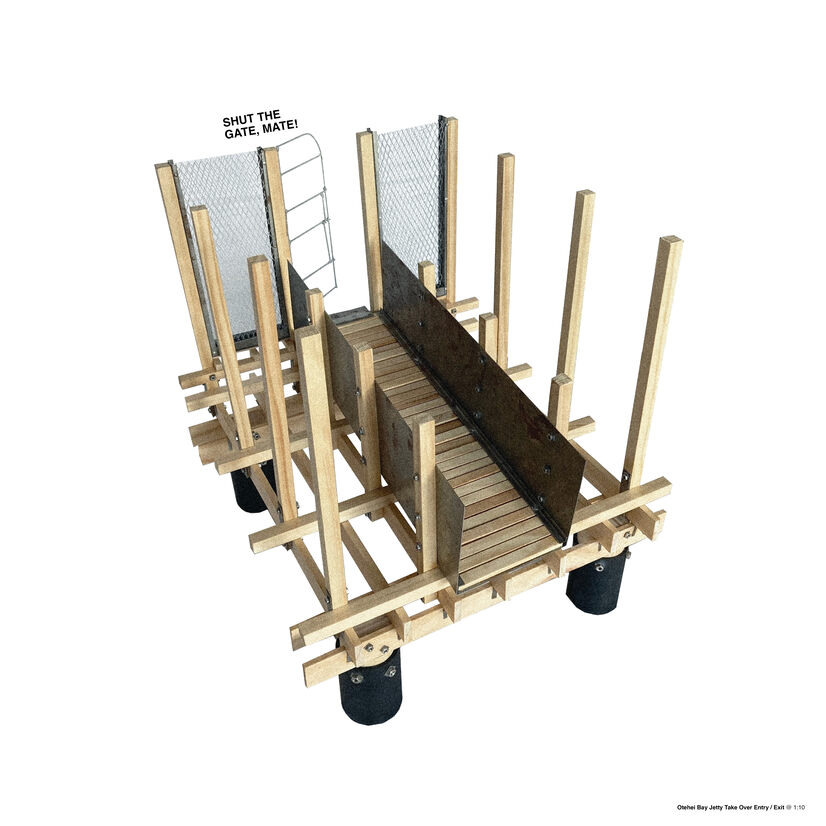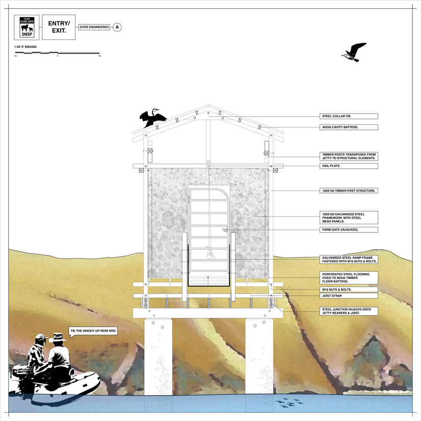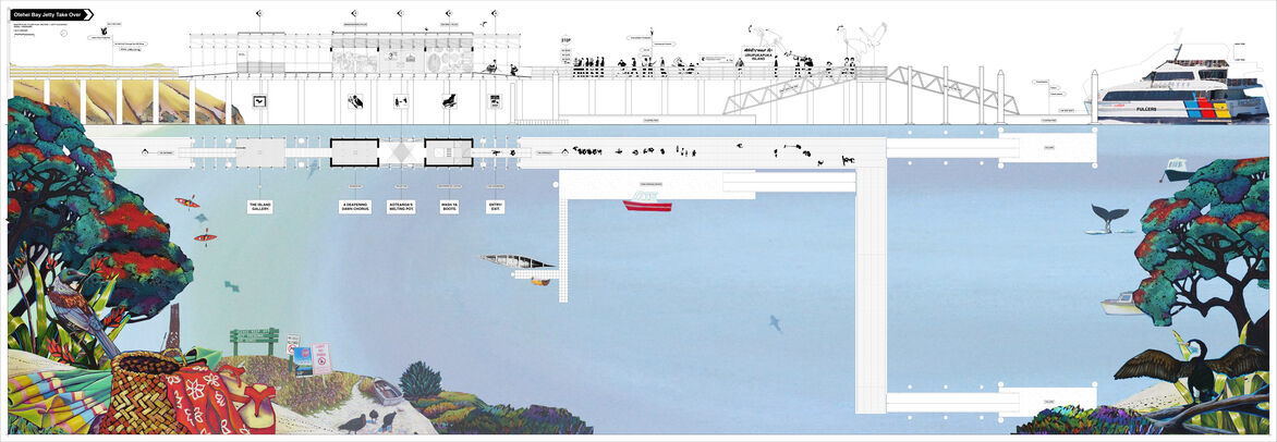 The Otehei Bay Jetty Take Over rejects junking the landscape, instead the architecture clings onto the existing jetty structure in the heart of Otehei Bay. The form is conceptually derived from the woolshed, the kiwi bach and the whare. In other words: New Zealand's fixation over the gable roof and eaves architecture. However, the programme is not a woolshed, bach or whare. The intervention is instead an unavoidable threshold upon entry to Urupukapuka Island acting as an island terminal, an information gauntlet and a linear tourist briefing.