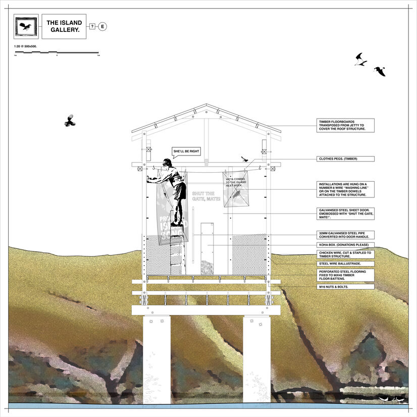 The Island Gallery acts as an exhibition space for Project Island Song, DoC, and local iwi / hapū, but it is not like a traditional gallery. The white walls of your average art gallery are stripped away, revealing views of the island. Media is hung out like on a washing line. A koha box sits in the centre of the space to promote supporting locals. The exit door is embossed with “shut the gate, mate!” and visitors then explore the island.