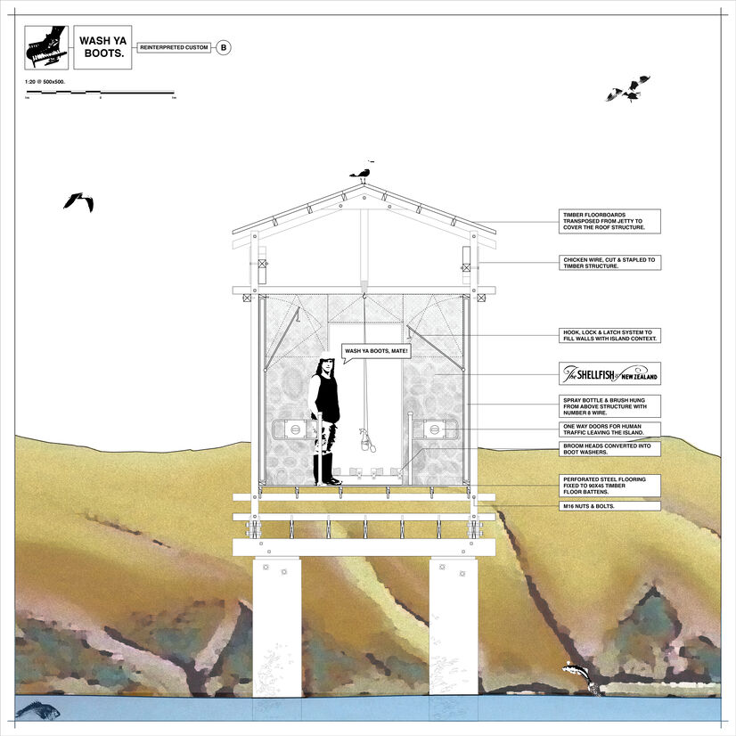 Wash Ya Boots acts as biosecurity for Urupukapuka Island and reinterprets the custom of removing your footwear. A scrubber and spray bottle are hung with number 8 wire and the space is enclosed by a cage-like enclosure filled with Urupukapuka sea shells, indicating the arrival by sea.