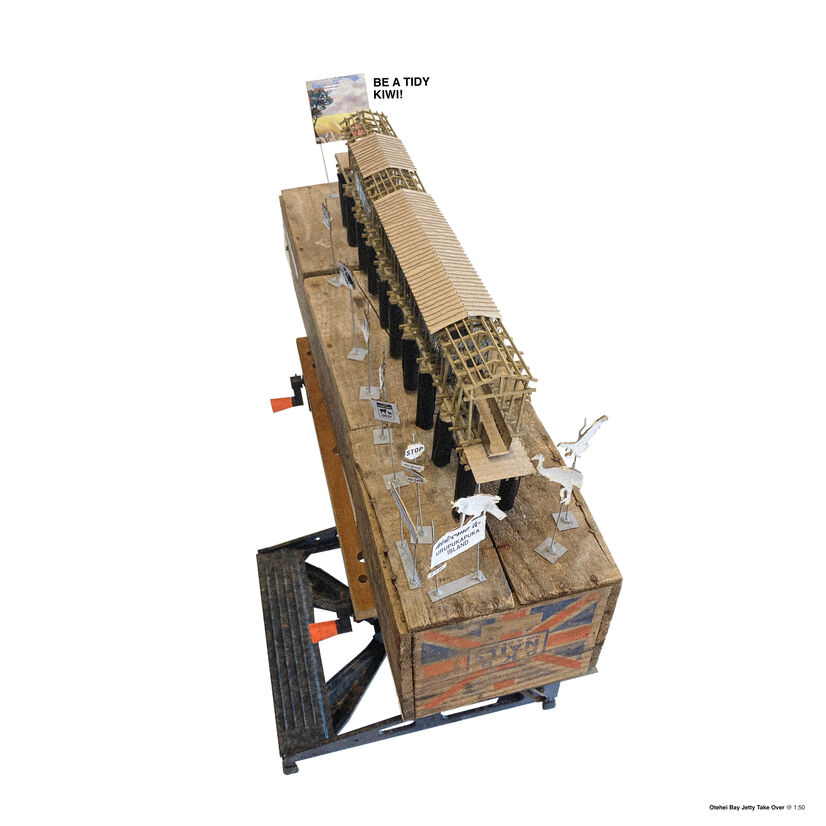 Visitors step off the Fuller$ ferry and are confronted by a series of politically and satirically charged signage scattered across the jetty. Animatronic and road signs allude to Kiwiana and the presence of old New Zealand.