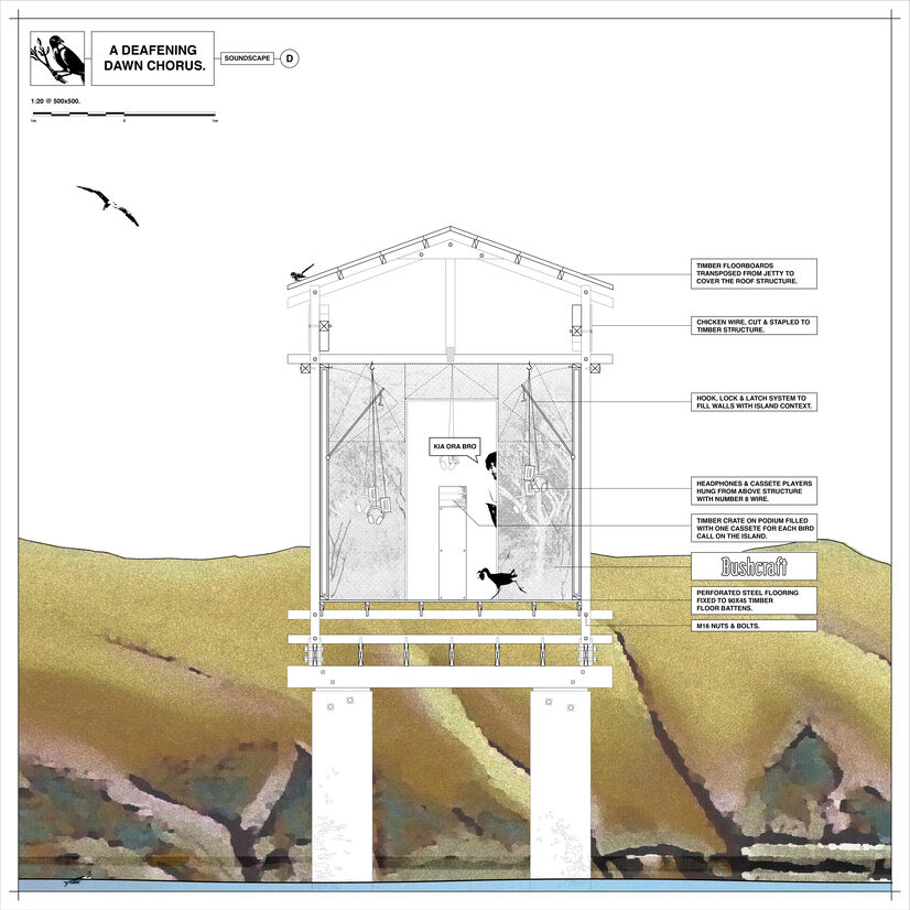 As part of a live project for Project Island Song, with key stakeholders being: Ngati Kuta and Patukeha hapū, DoC and the Guardians of the Bay of Islands, this project was a radical response to the brief of a “focal point” on Urupukapuka Island.
