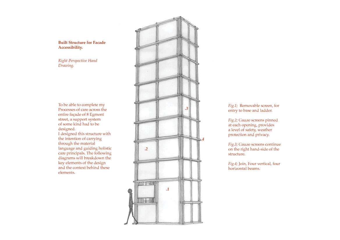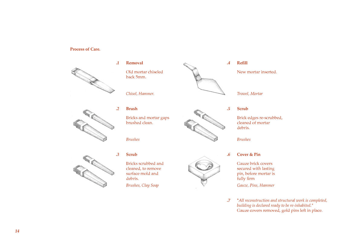 This project considers whether practices of holistic healing can be extended beyond the normal empathetic range to include heritage architecture that has, suffered or is, suffering earthquake trauma. By personifying architecture through its historical, social and cultural layers and connections, brick and mortar can be, and should be afforded personal, body to body care and respect usually reserved for human to human healing. This project re-frames the perception of dormant, traumatized architecture, afflicted by un-inhabitation and reconstruction. By creating a practitioner, patient relationship between myself and a body of brick the building becomes a relatable and recognizable character for the surrounding communities, who have experienced know the trauma of earthquakes. Through this act of care I can uplift the building’s character and face, renewing its place in the community and culture of the wider site, to celebrate longevity and trauma as part of its character.