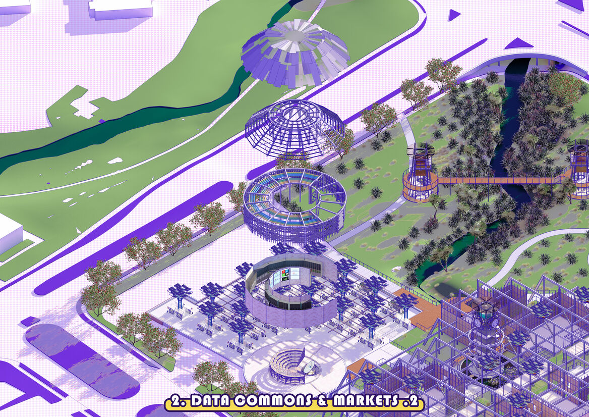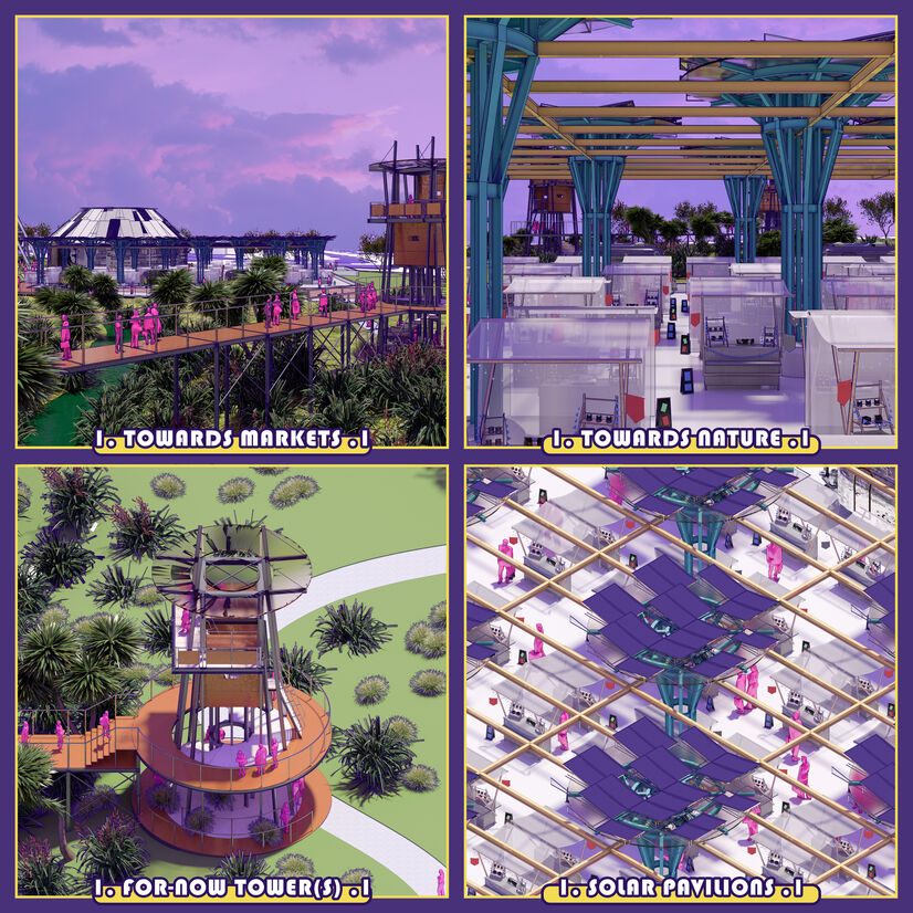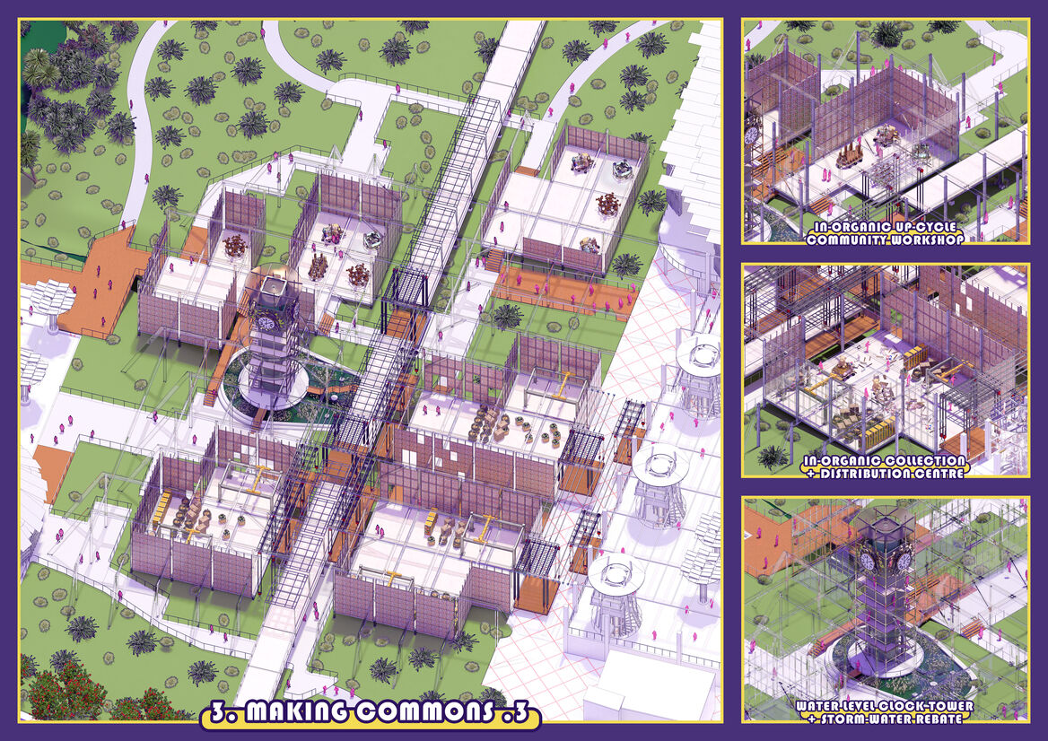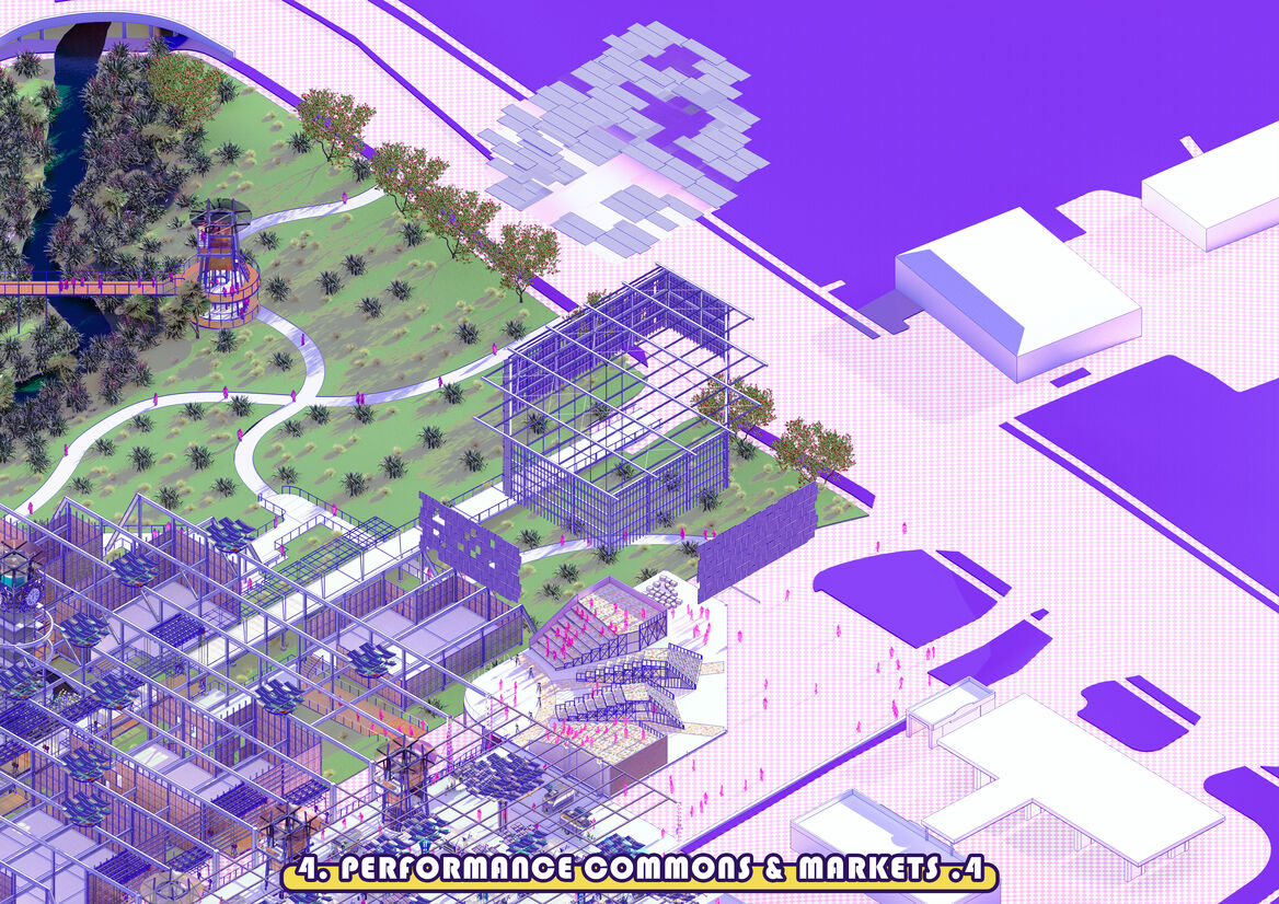 So, in the spirit of a dreamscape or fever-dream, a speculative remake of the Highland Park Town Centre was pursued, one that sought a consolidation of key sustaining commons—those indicative of nature, community-making, performance and data democracy. Like paired dwarf stars in collision, the two supermarkets were made to release with their unboxing a field of matter opportunistically reassembled and pivoted about the town centre’s adaptively recalibrated clock tower—in short, a new relationship with time and its placement. Contrary, supermarket grids provide a flexible gantry framework for community-assembled projects and festival infrastructure. To the southwest lies a data-commons for collective adjudication over data-use; to the northeast a performance arena; to the northwest an opening up of the original wetlands; and east and west, on either side of a central parade axis, solar-powered, pop-up market structures fulfil the shopping mandate previously boxed in by corporate interests.