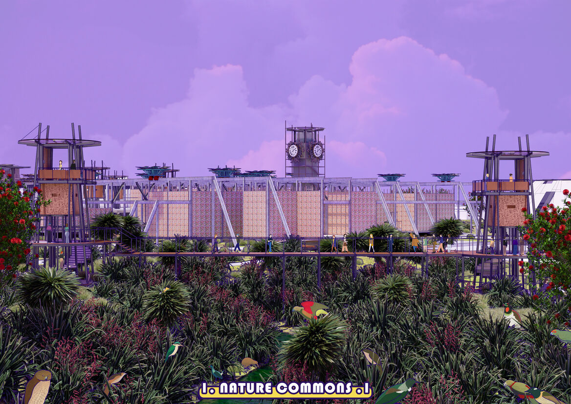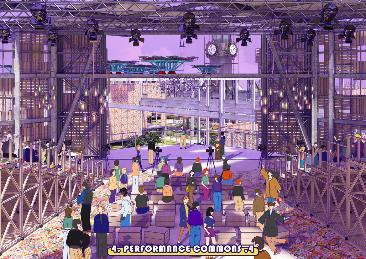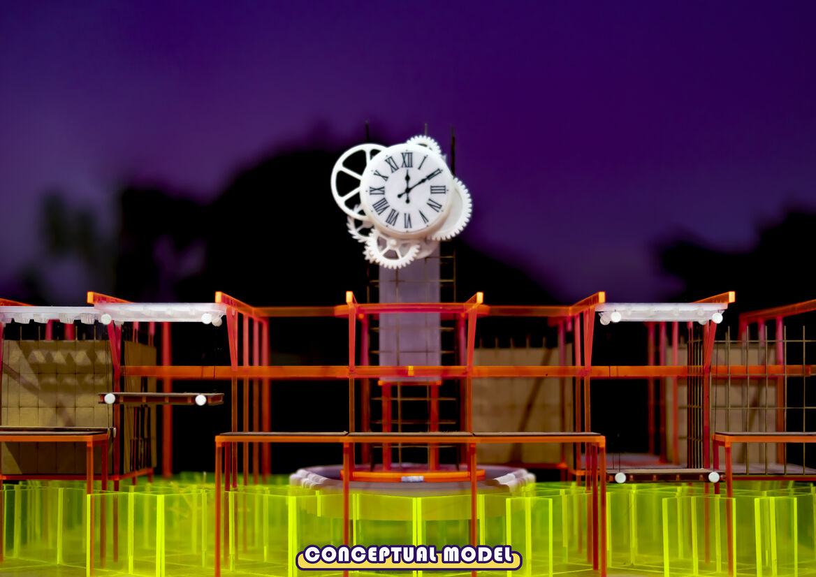 So, in the spirit of a dreamscape or fever-dream, a speculative remake of the Highland Park Town Centre was pursued, one that sought a consolidation of key sustaining commons—those indicative of nature, community-making, performance and data democracy. Like paired dwarf stars in collision, the two supermarkets were made to release with their unboxing a field of matter opportunistically reassembled and pivoted about the town centre’s adaptively recalibrated clock tower—in short, a new relationship with time and its placement. Contrary, supermarket grids provide a flexible gantry framework for community-assembled projects and festival infrastructure. To the southwest lies a data-commons for collective adjudication over data-use; to the northeast a performance arena; to the northwest an opening up of the original wetlands; and east and west, on either side of a central parade axis, solar-powered, pop-up market structures fulfil the shopping mandate previously boxed in by corporate interests.