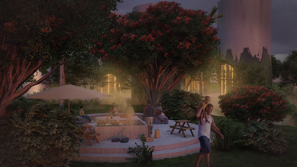 Some of the original silos have been retained and transformed into event spaces. Their old facades now feature openings that allow for suspended artworks and breathtaking aerial performances while their night-time illumination creates a compelling ambiance around them. Newly designed silos serve as vertical farming hubs, offering Aucklanders a chance to grow food, support native plant nurseries and nurture meaningful encounters. Participants will have the opportunity to better understand ecosystems and the need for their protection. Picnic pads throughout the islands are equipped with hangi pits, where people can cook, share food, and strengthen community bonds. Smaller installations act as insect hotels and beehives, allowing people to support essential pollinators responsibly.