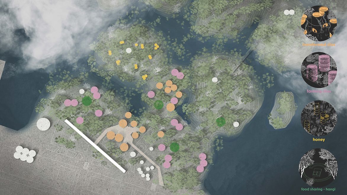 This project allows nature and the community of Auckland to re-claim the (re)claimed land by moulding it into diverse Island environments with varying ecosystems. Next to natural rehabilitation, creating non-commercial gathering spaces was a primary goal. These new spaces aim to reconnect people with each other and the living environment of New Zealand. Four modules have been developed - event spaces, farming silos, hangi pits, and insect hotels - to support the reclamation process, acting as catalysts to foster a symbiotic relationship between the land, water, people, and other living creatures.