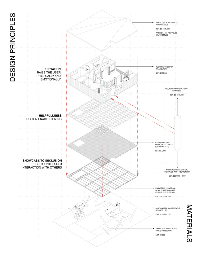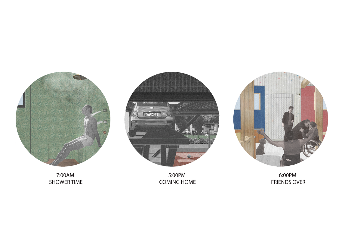 HELPFULNESS - My design created a challenge free safe haven for Sam; the only space in the world that catered entirely to his needs. The repurposed hydraulic lift allows Sam to drive directly into the house, making access a breeze. The layout has a heavy focus on circulation with wide corridors; windows and surfaces are at a lower level allowing Sam to see throughout the house and outside; and almost all furniture is built in, ensuring transferring from a wheelchair is easy and safe.