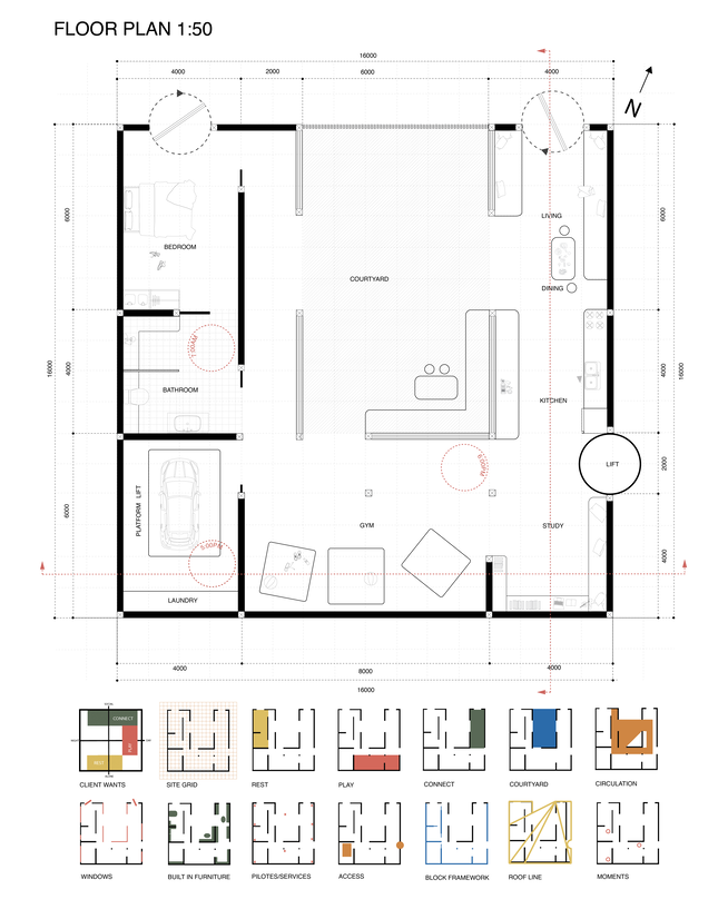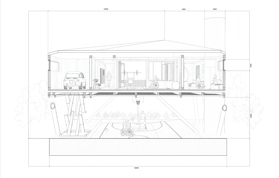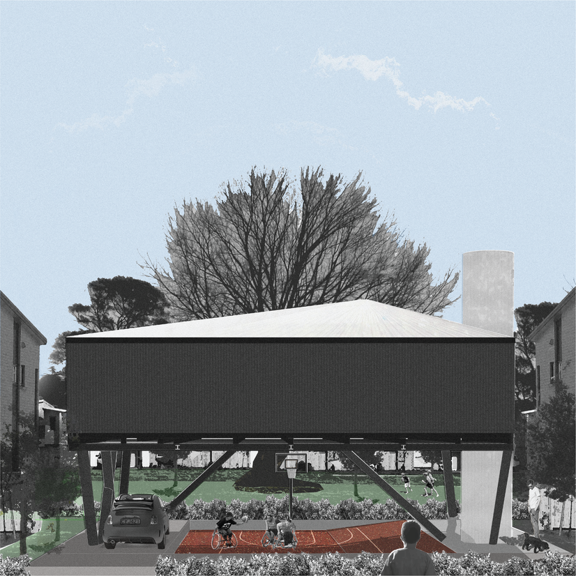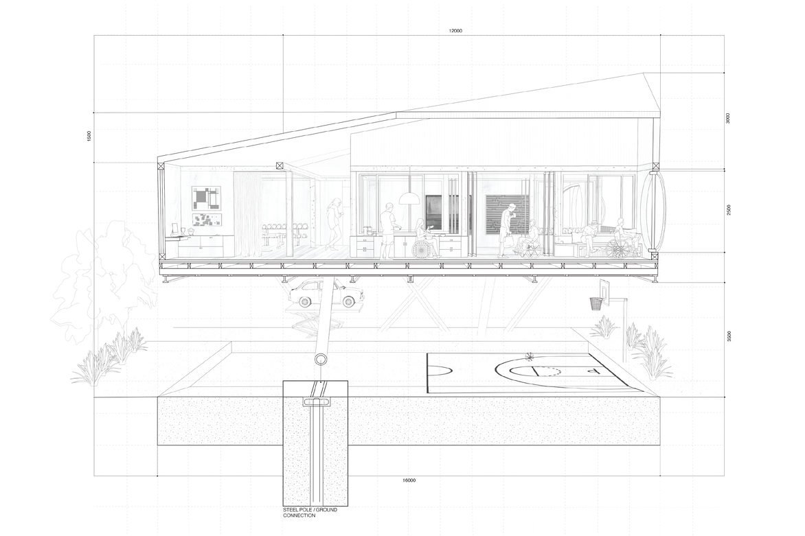ELEVATION - Imagine life in a wheelchair where you view the world four feet off the ground. It was key to elevate Sam both physically and emotionally and create a challenge free safe haven without looking like the home was designed for a wheelchair user. I wanted to elevate Sam so he felt 20 feet tall – lifted above the world. Lifting the house off the ground gave me an opportunity to place a basketball court underneath, giving Sam the opportunity to interact with his local community on his own terms - showcasing what wheelchair users can do, educating others by shooting hoops with his neighbours and creating a positive and accessible image around those with less able bodies.