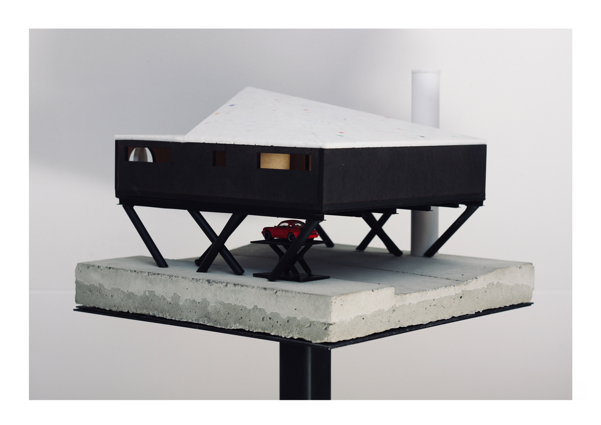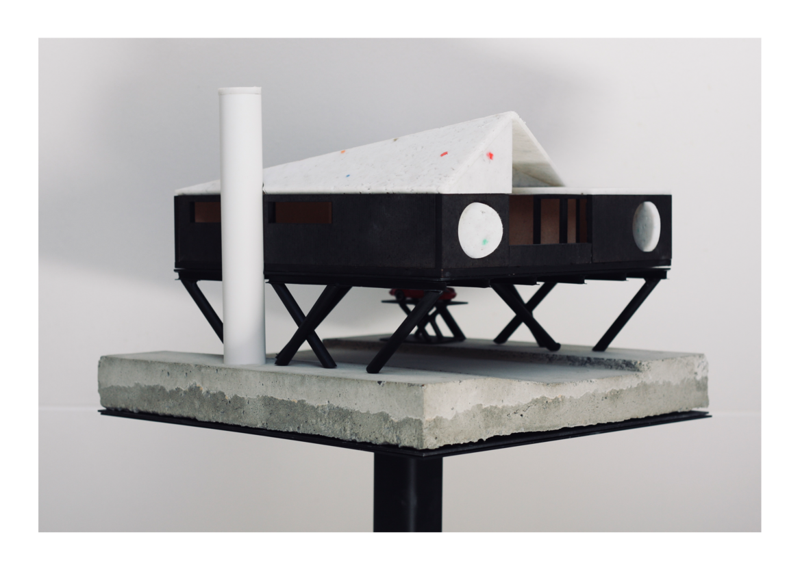 The roof is made of recycled milk bottle tiles I produced after much experimentation with steel molds, pressure and heating methods. The framework of the house adopts a modular system designed with a group of peers as the other part of our design paper. This modular system was intended to generate a new interpretation of suburban development and create a diverse and eclectic group of houses, both accessible and desirable to a wide variety of people.