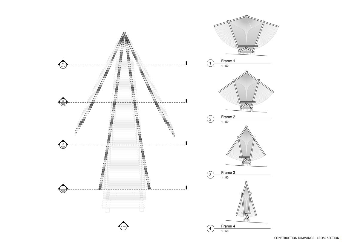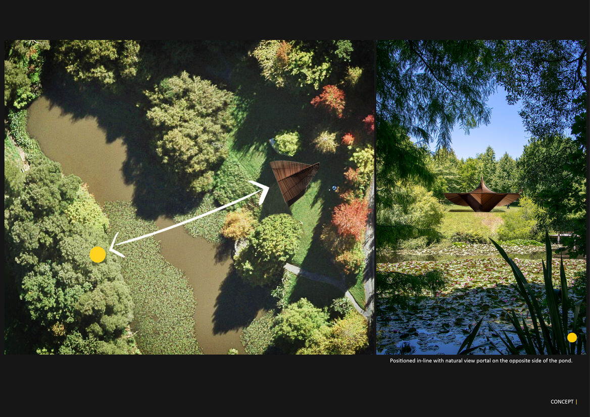 The pavilion rests on a gentle slope, with its wings spread, surveying the woodlands over the lake. It’s a quiet participant of the visitor’s journey, encouraging them to dwell for a little longer under its shade, to realize the beautiful details of their surroundings that they may have missed.