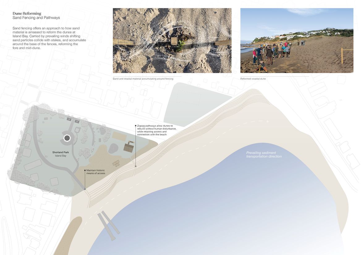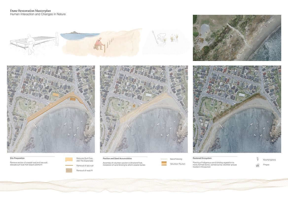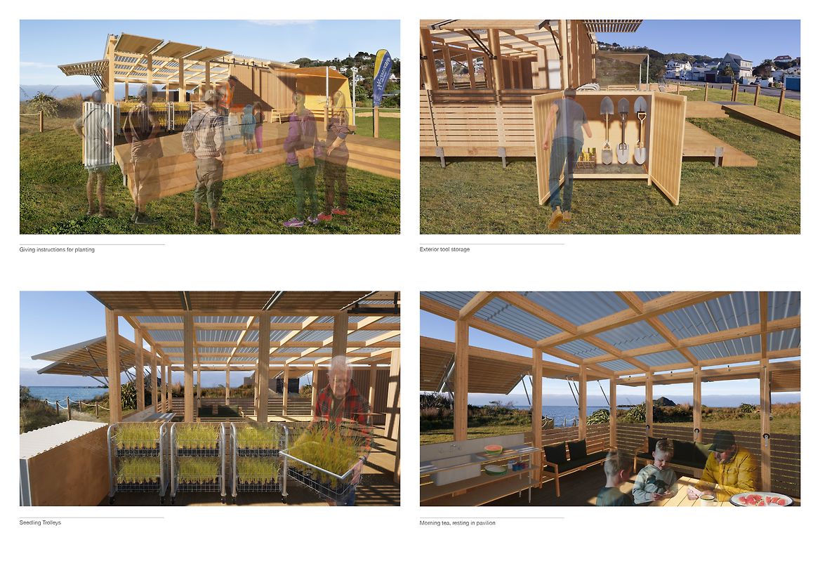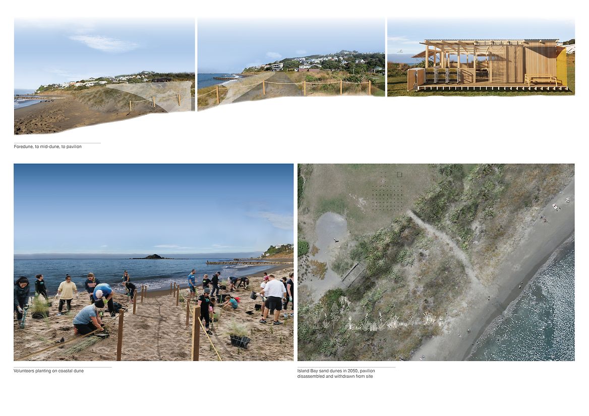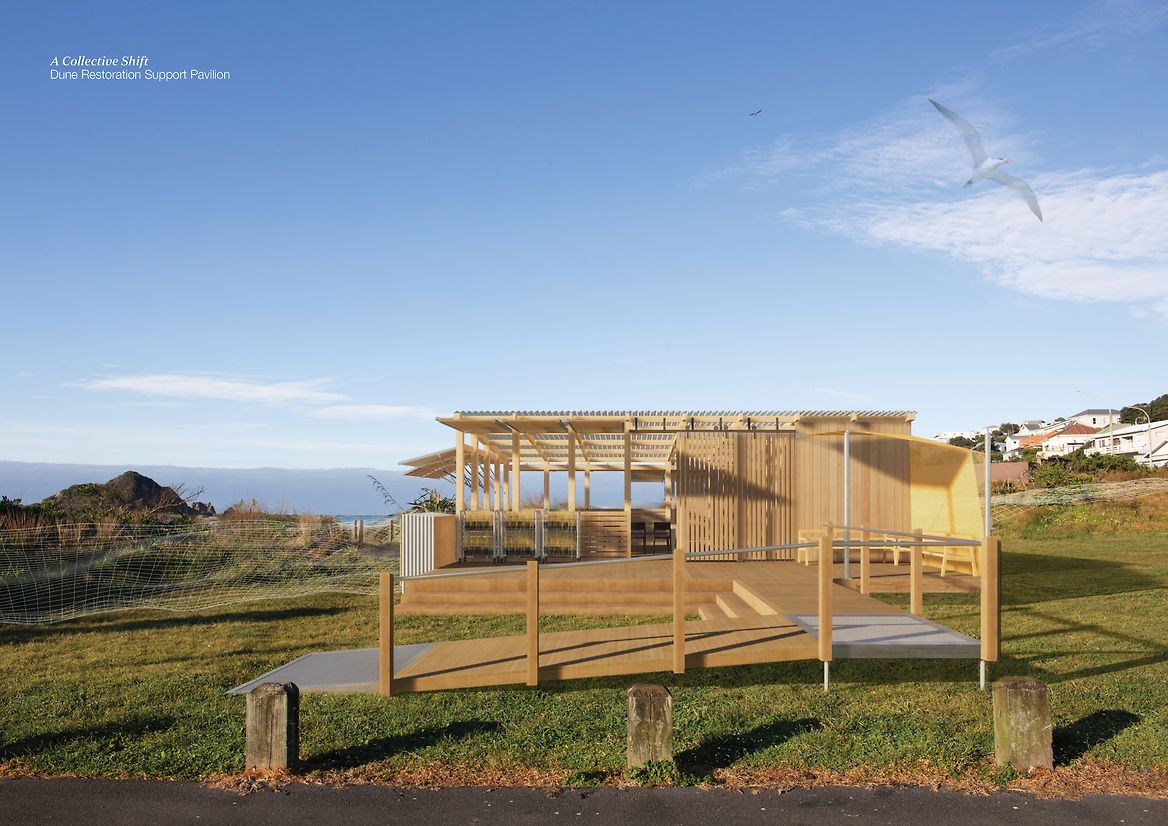 A Collective Shift investigates coastal resiliency strategies for Island Bay, Te Whanganui-a-Tara, necessitated by rising sea levels caused by climate change. This project proposes restoring the original coastal dunes to replace the current sea wall, to allow the ecosystem to carry out its innate role of adapting to and protecting the area. I have designed a temporary pavilion to offer shelter and equipment to volunteer community groups, to host them as they restore this vital ecosystem. A Collective Shift engages with the foreshore site by reinstating coastal dunes along the esplanade. The pavilion intervention will be constructed and withdrawn from the site following the completed planting of the coastal dune strip. In the future when the area may no longer be suitable for human habitation, this research advocates that the favourable intergenerational option for ecologies and communities is to have conscious strategies to relocate homes to safer areas. The project offers an approach to coastal dune restoration and a means for how human interaction can enhance the site’s vitality. The pavilion is designed with storage to hold native sand binding kowhangatara and pingao seedlings, landscaping tools, as well as a locker to stow personal belongings while volunteers are out on the dunes. It’s composed of uncovered and sheltered seating areas and includes an accessible bathroom, access to drinking water and dining areas. The pavilion utilises modular design for deconstruction methodology, allowing it to be withdrawn from the site with minimal trace once the ecosystem is restored. The design applies deconstruction at a modular level including the foundations, framing, cladding and roofing components—as these modules function at a greater level—rather than the deconstruction of individual elements. It focuses on the technical ability of materials to be separated, using quality materials for optimal reuse. The design employs dry methods of assembly using mechanical fasteners over adhesives or welding, utilising as few strong fasteners as possible; bringing into action connections that are accessible for the process of assemblage and deconstruction. Together, these modules make up the deck platform and pavilion shelter. The space facilitates agency for volunteers through programmes that enhance practical skills of nurturing and caring for the local environment. These programmes in turn enhance the coastal resiliency strategy for Island Bay through active care, education, and community interaction by restoring adaptive, thriving ecosystems. The reinstated foredunes radicalise the design purpose, guided by the bay's innate power and what this place naturally calls for. Humans removed this system, and it will take human intervention to restore it. While the pavilion can facilitate the act of planting in a matter of years, the dunes will grow and exist for centuries. A Collective Shift provides the short-term physical infrastructure, and an approach to restoration, enabling the dune systems to regain their course as a resilient, self-sustaining ecosystem.