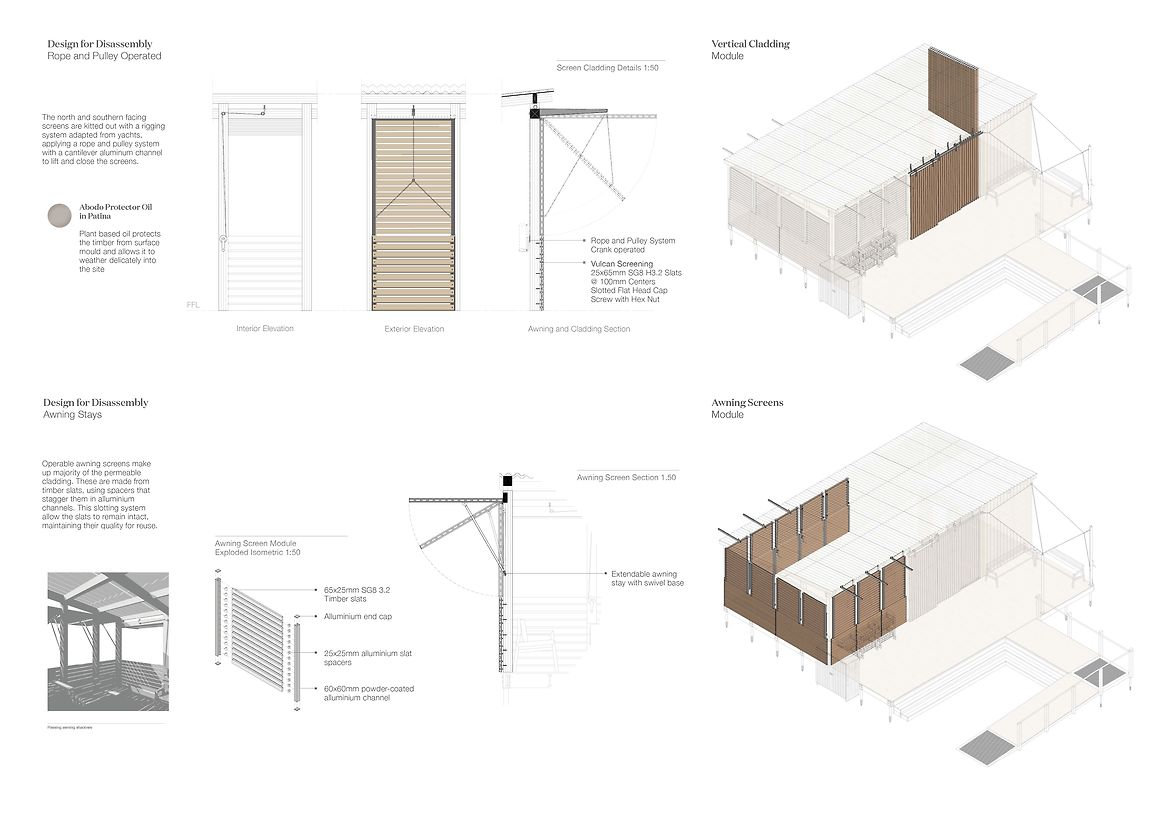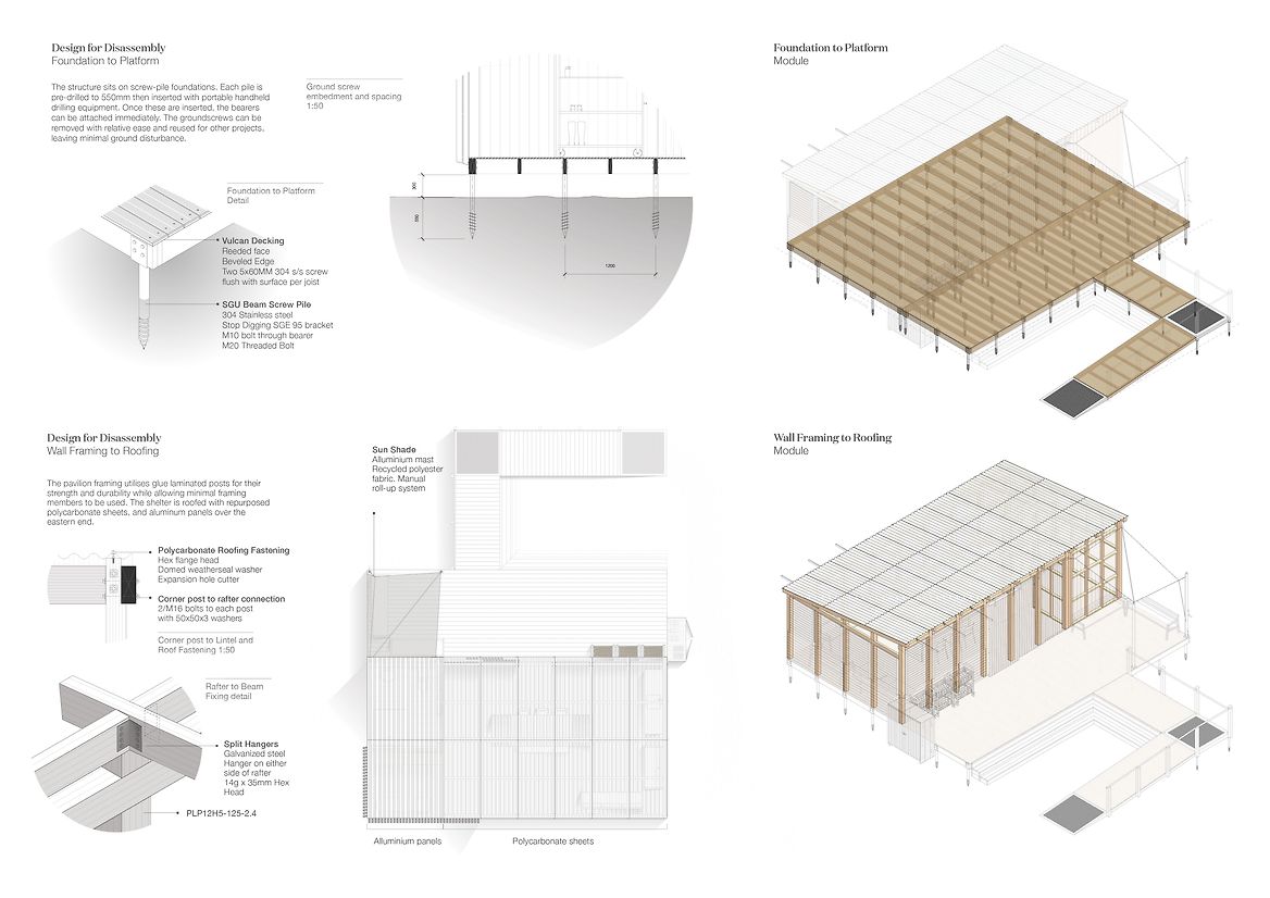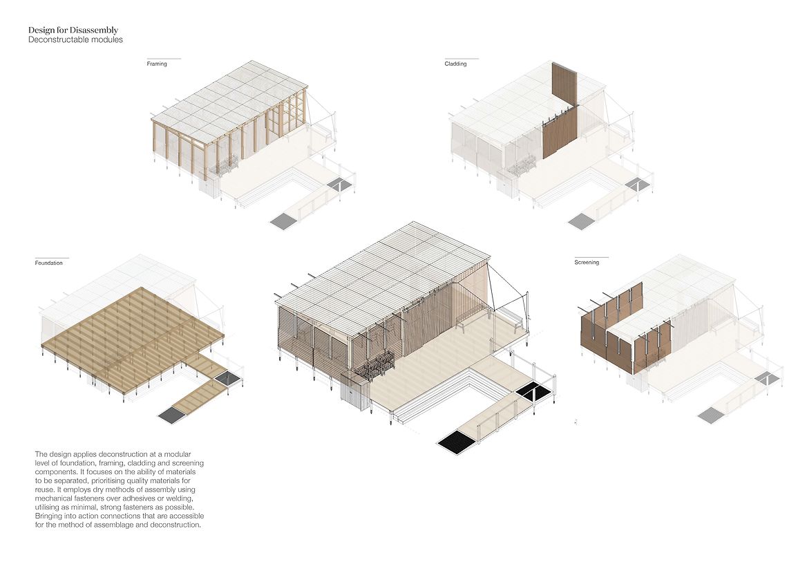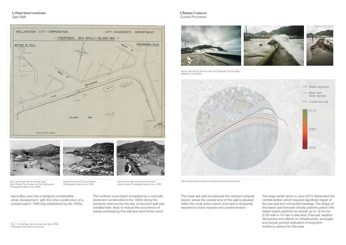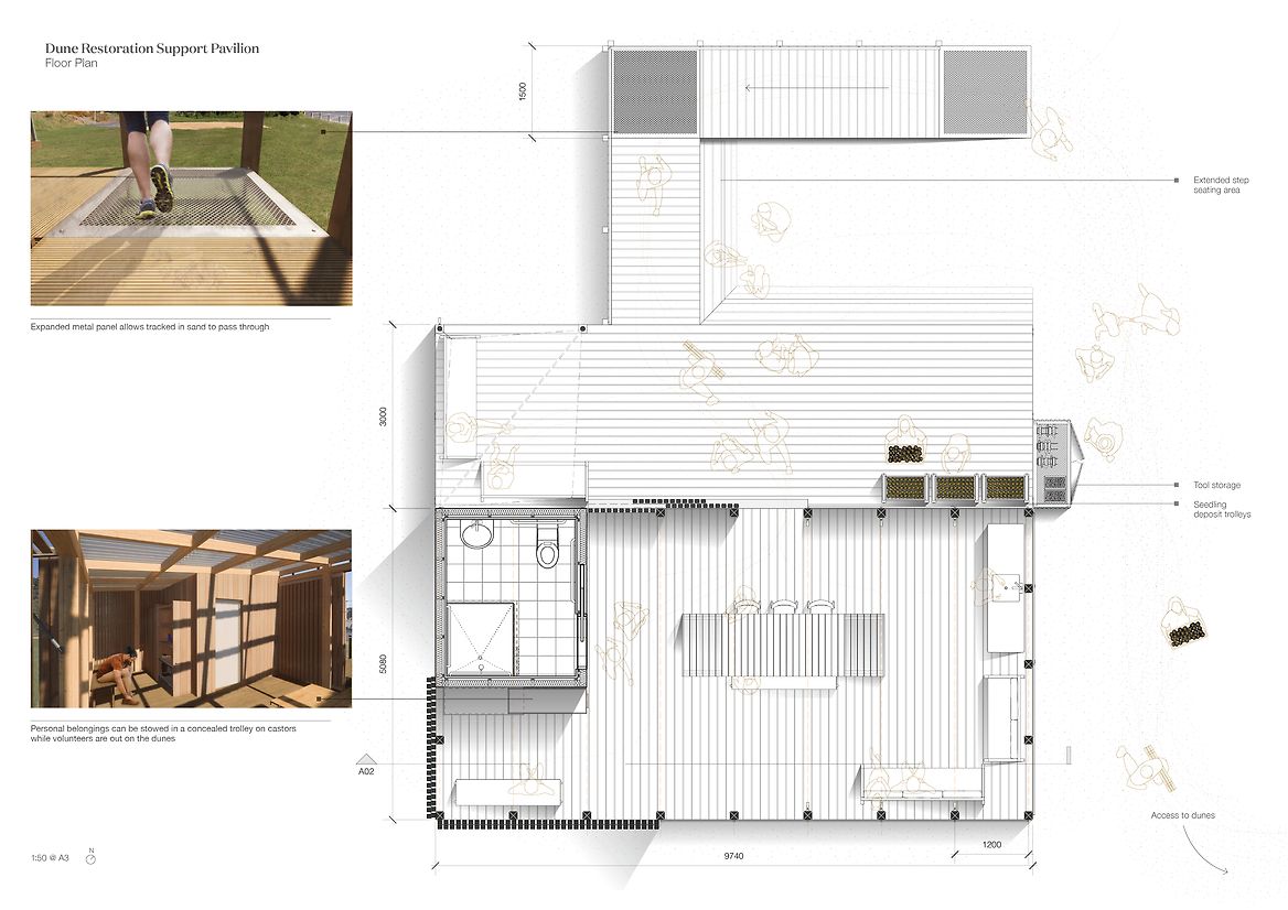 A Collective Shift investigates coastal resiliency strategies for Island Bay, Te Whanganui-a-Tara, necessitated by rising sea levels caused by climate change. This project proposes restoring the original coastal dunes to replace the current sea wall, to allow the ecosystem to carry out its innate role of adapting to and protecting the area. I have designed a temporary pavilion to offer shelter and equipment to volunteer community groups, to host them as they restore this vital ecosystem. A Collective Shift engages with the foreshore site by reinstating coastal dunes along the esplanade. The pavilion intervention will be constructed and withdrawn from the site following the completed planting of the coastal dune strip. In the future when the area may no longer be suitable for human habitation, this research advocates that the favourable intergenerational option for ecologies and communities is to have conscious strategies to relocate homes to safer areas. The project offers an approach to coastal dune restoration and a means for how human interaction can enhance the site’s vitality. The pavilion is designed with storage to hold native sand binding kowhangatara and pingao seedlings, landscaping tools, as well as a locker to stow personal belongings while volunteers are out on the dunes. It’s composed of uncovered and sheltered seating areas and includes an accessible bathroom, access to drinking water and dining areas. The pavilion utilises modular design for deconstruction methodology, allowing it to be withdrawn from the site with minimal trace once the ecosystem is restored. The design applies deconstruction at a modular level including the foundations, framing, cladding and roofing components—as these modules function at a greater level—rather than the deconstruction of individual elements. It focuses on the technical ability of materials to be separated, using quality materials for optimal reuse. The design employs dry methods of assembly using mechanical fasteners over adhesives or welding, utilising as few strong fasteners as possible; bringing into action connections that are accessible for the process of assemblage and deconstruction. Together, these modules make up the deck platform and pavilion shelter. The space facilitates agency for volunteers through programmes that enhance practical skills of nurturing and caring for the local environment. These programmes in turn enhance the coastal resiliency strategy for Island Bay through active care, education, and community interaction by restoring adaptive, thriving ecosystems. The reinstated foredunes radicalise the design purpose, guided by the bay's innate power and what this place naturally calls for. Humans removed this system, and it will take human intervention to restore it. While the pavilion can facilitate the act of planting in a matter of years, the dunes will grow and exist for centuries. A Collective Shift provides the short-term physical infrastructure, and an approach to restoration, enabling the dune systems to regain their course as a resilient, self-sustaining ecosystem.