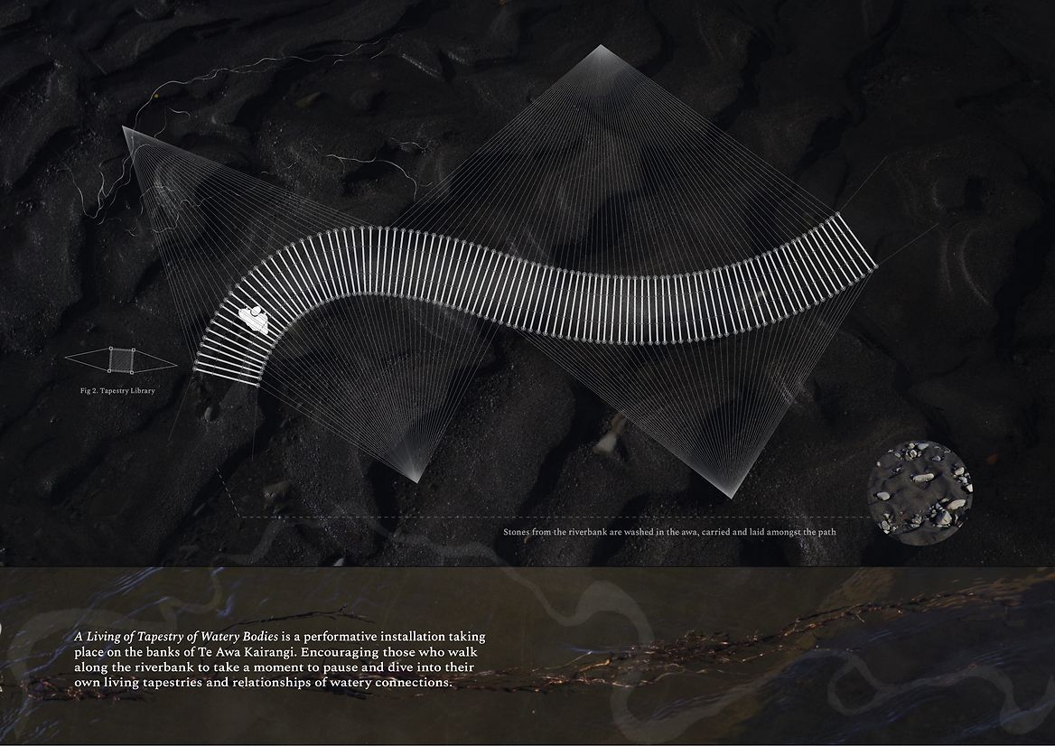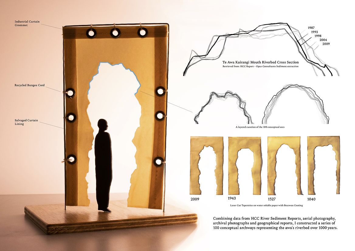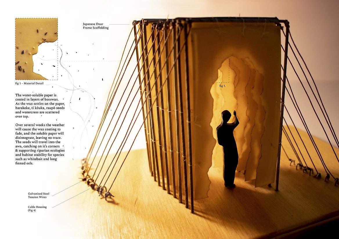 This spatial design proposal seeks to foster moments of connection between those walking along the banks of Te Awa Kairangi to their watery bodies and tapestries within. One hundred laser-cut thresholds are positioned on the corner of the riverbank, located outside the wind tunnel and where the willows embrace, casting fragmented shadows onto the earth. The thresholds are constructed from water-soluble paper and coated in layers of beeswax. While layering beeswax onto the sheets, harakeke, tī kouka, raupō and watercress
