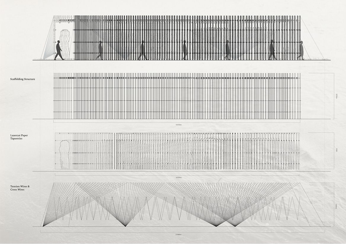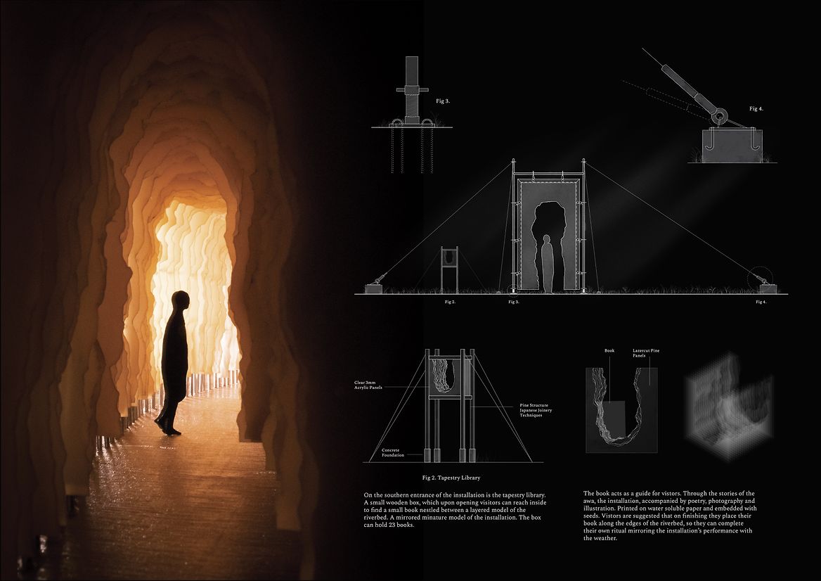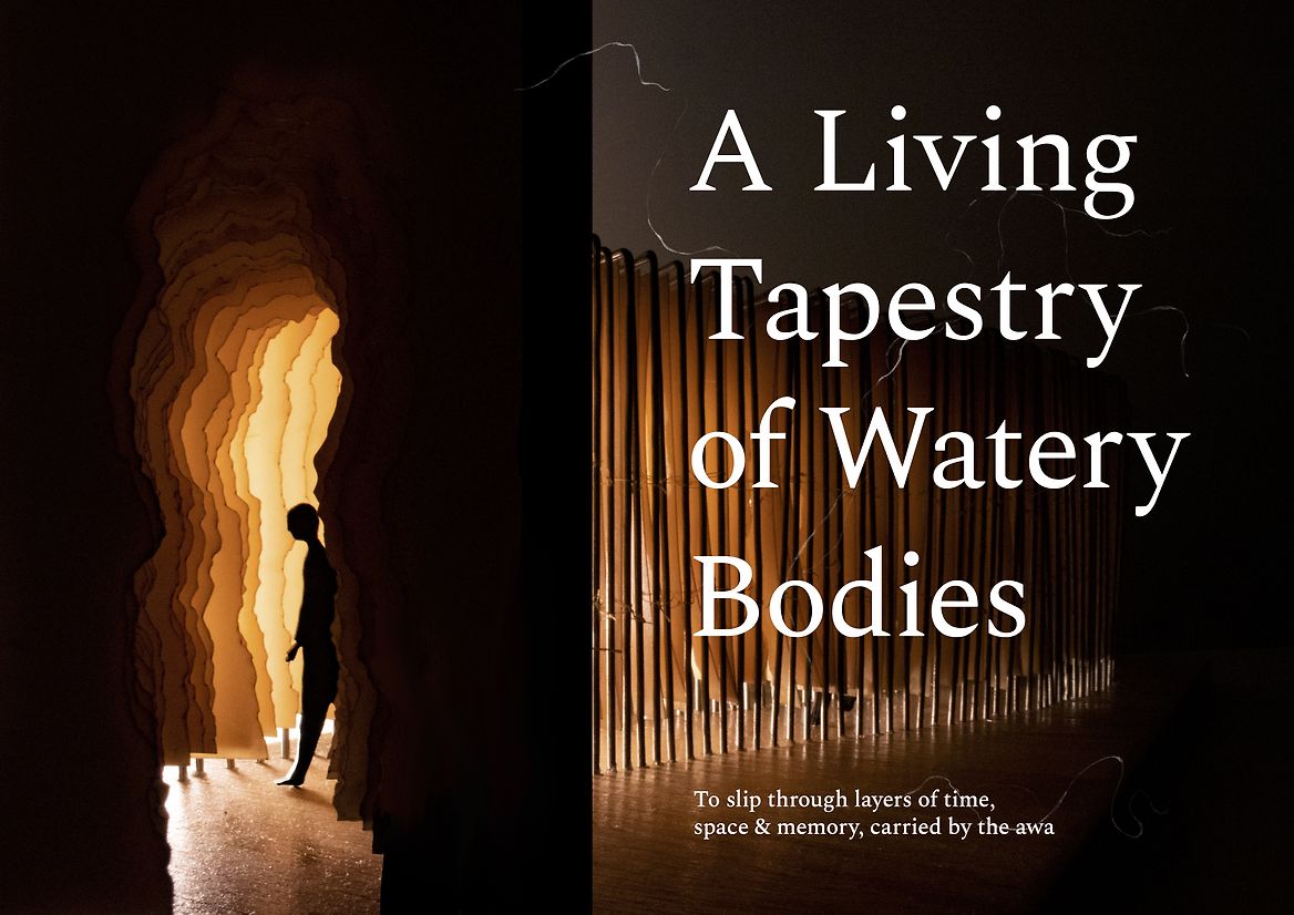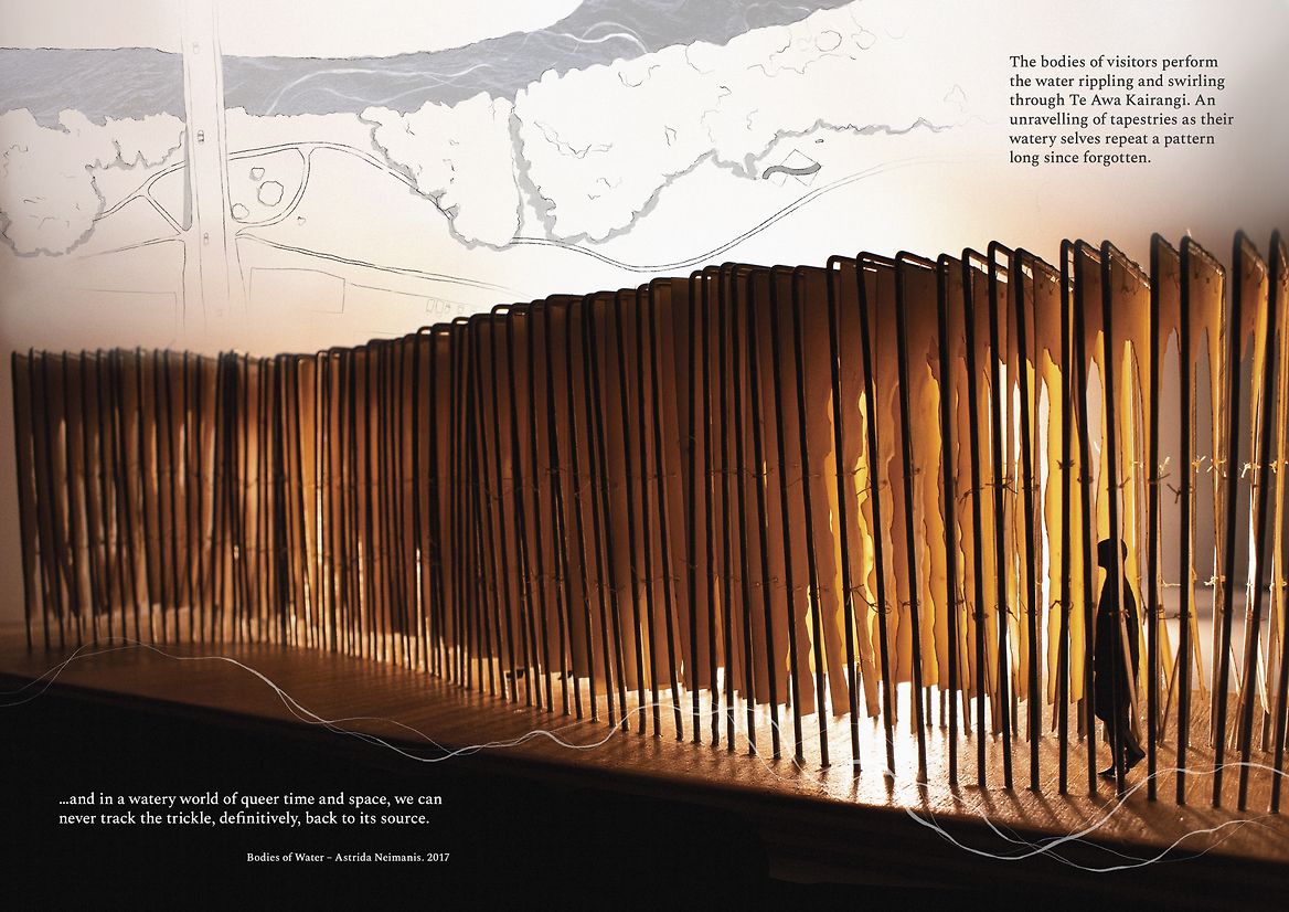 This spatial design proposal seeks to foster moments of connection between those walking along the banks of Te Awa Kairangi to their watery bodies and tapestries within. One hundred laser-cut thresholds are positioned on the corner of the riverbank, located outside the wind tunnel and where the willows embrace, casting fragmented shadows onto the earth. The thresholds are constructed from water-soluble paper and coated in layers of beeswax. While layering beeswax onto the sheets, harakeke, tī kouka, raupō and watercress