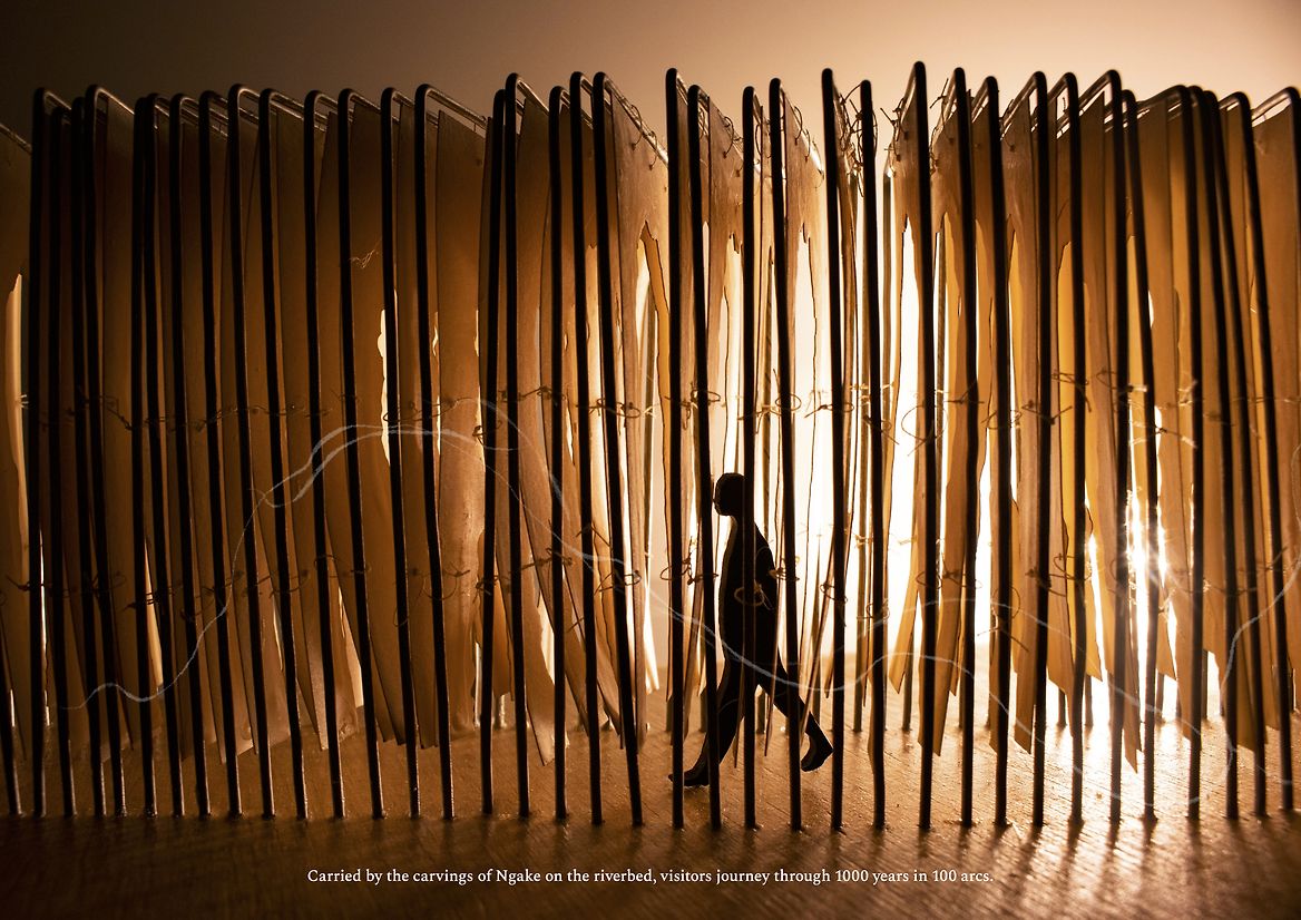 The thresholds hold the shape of the riverbed, changing over a thousand years. As people move and walk through the installation, their watery bodies perform the role of the awa, ebbing and flowing, rippling, swirling vibrations. An immersive experience where people can feel the carvings of Ngake’s tail on the land and see the wonder and wildness of Te Awa