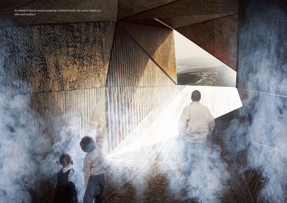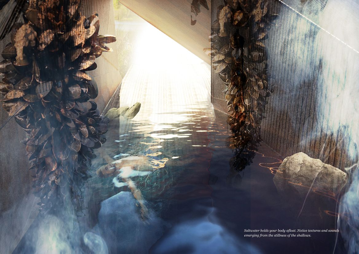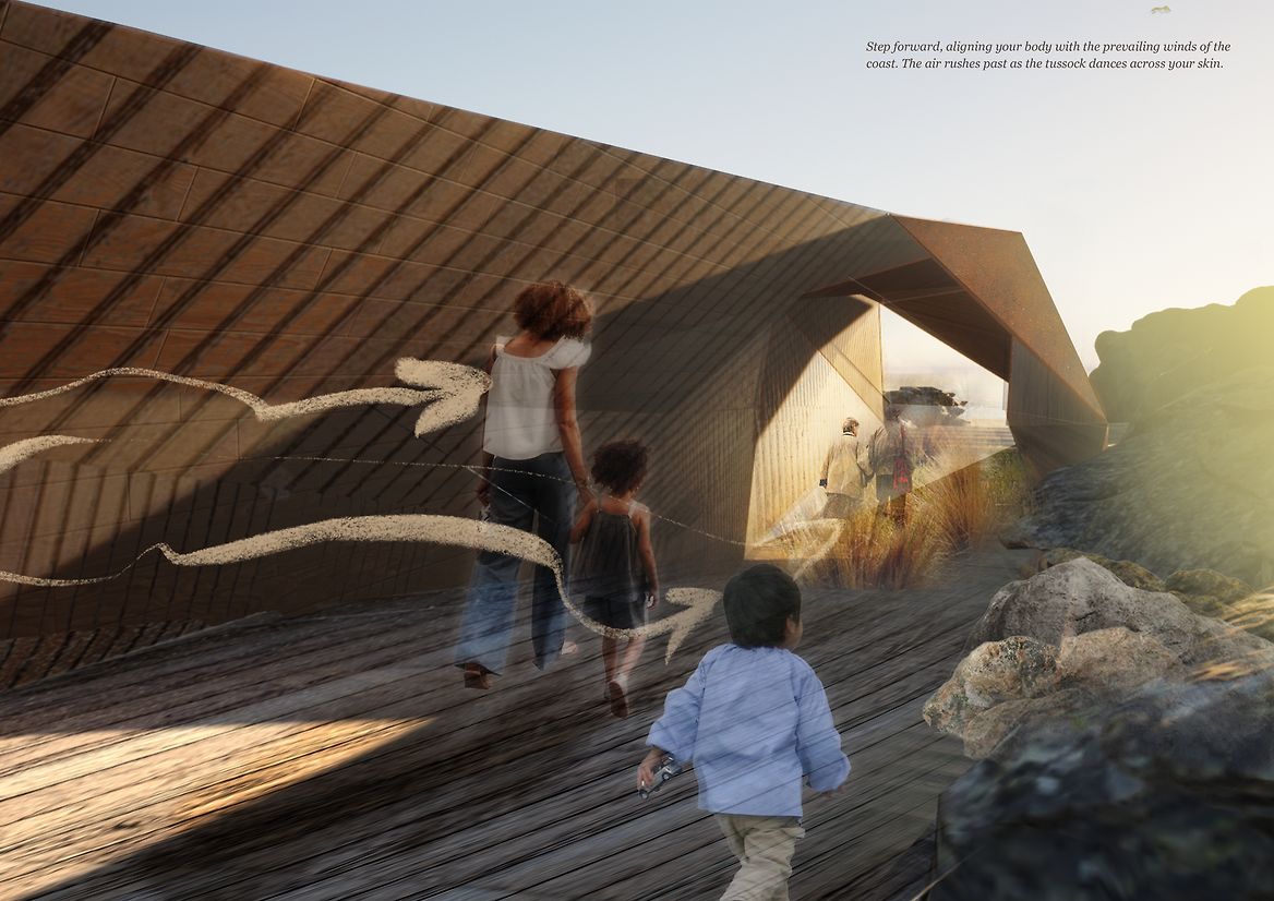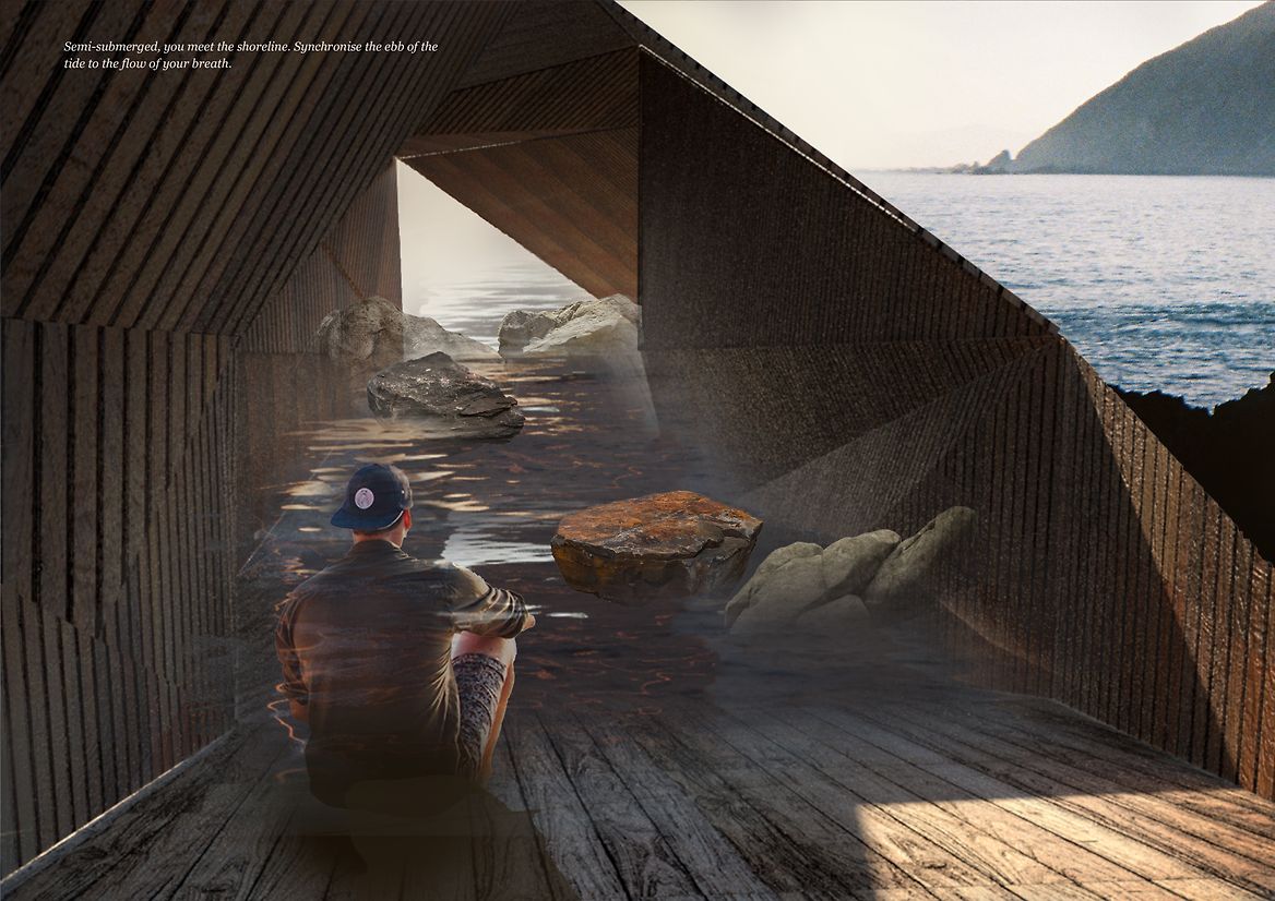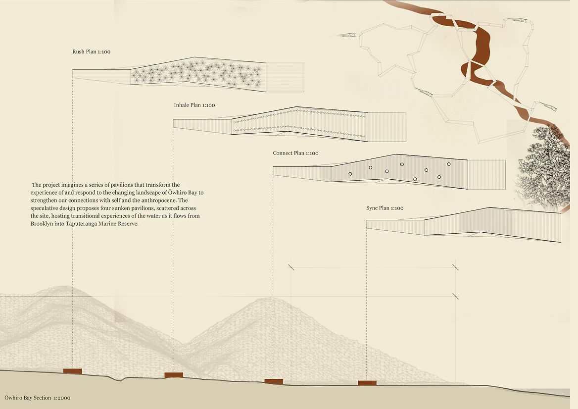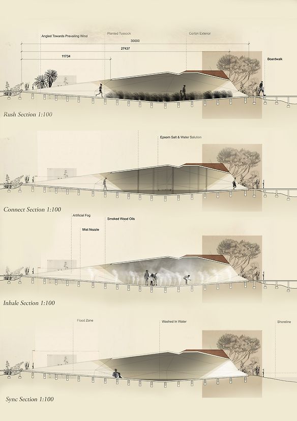 The speculative design proposes four sunken pavilions, scattered across the site, hosting transitional experiences of the water as it flows from Brooklyn into Taputeranga Marine Reserve. The first structure hosts a dynamic entrance to the site, situated to allow the prevailing wind to blow through the space, brushing the tussock along your skin. The second pavilion harvests rainwater, mixing it with high concentrations of salt to enable one’s body to float. Third space encompasses the evaporation phase of water, in low visibility steam will bead on the skin and fill the structure. The final structure will be semi-submerged into the shoreline, one can sit and listen to the rhythmic lapping of the tide. The material and surfaces of the structures are able to host and nurture ecologies in the site once flooded.