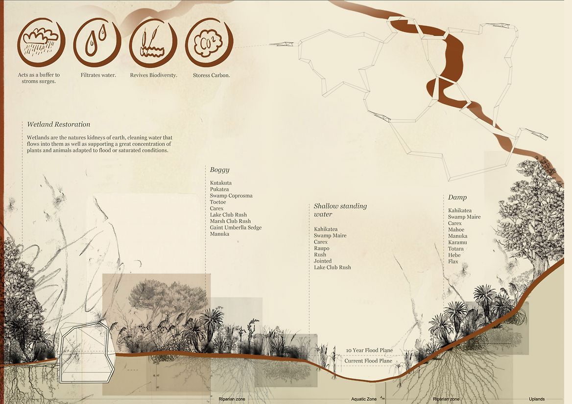 This research develops a deeper understanding of non-human perspectives and designing in response to this, to help regenerate wetland ecologies. The relationships of existing communities are considered in this speculative design, offering ways to connect and visit the space as it transitions between zones of access as the sea level rises. This design considers how we can look at expansive recreation as a framework to aspire and facilitate both new and old relationships to the site in response to the changing nature of the environment as a result of climate change and sea level rise.