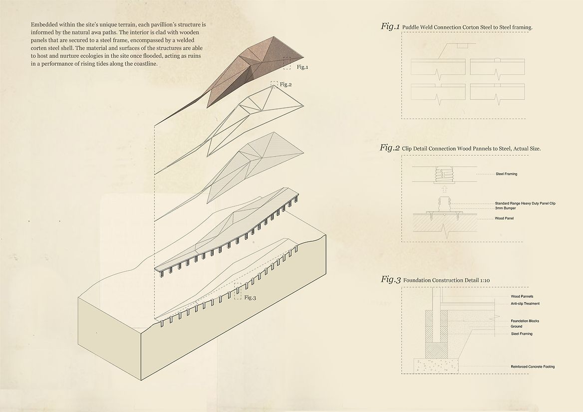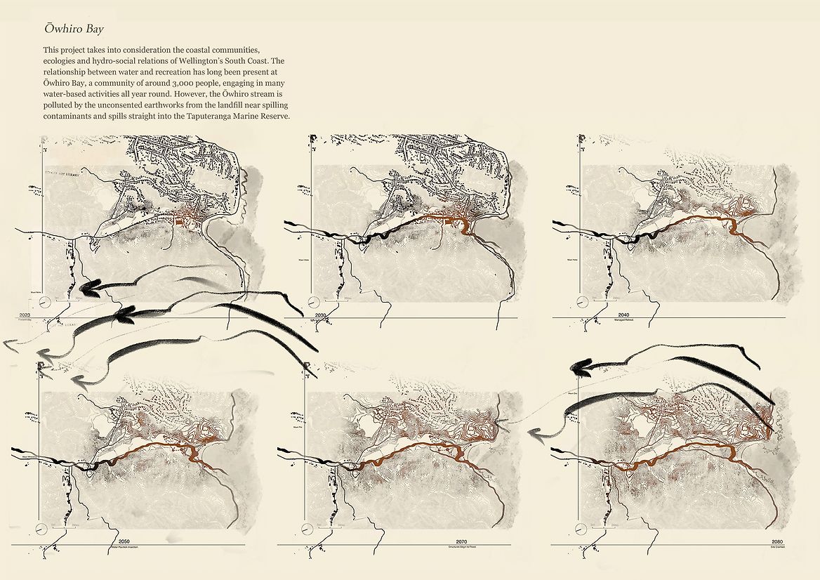 Ōwhiro Bay consists of low lying contours, making the effects of sea levels rising evident on their shores. Informed by considerations of recreation, hydrological interactions and more than human theory, the project responds to the changing landscape of Ōwhiro Bay. This project looks to the coastline and lower-lying catchment areas of Ōwhiro Bay, a site centred upon the mouth of the valley, currently marked by Happy Valley Rd and a radius of around 1 km. If coastal communities are not able to inhabit the exposed coast with threats of climate change, could we live in space differently? Spatial intervention strategies are employed that move away from disrupting the environment and instead, let the terrain and natural awa paths inform the design of the structures and the experiences within them. The space will be an inclusive, equitable and universal design to host our last inhibitable years in the space, creating a sense of place, connection and nurture for all.