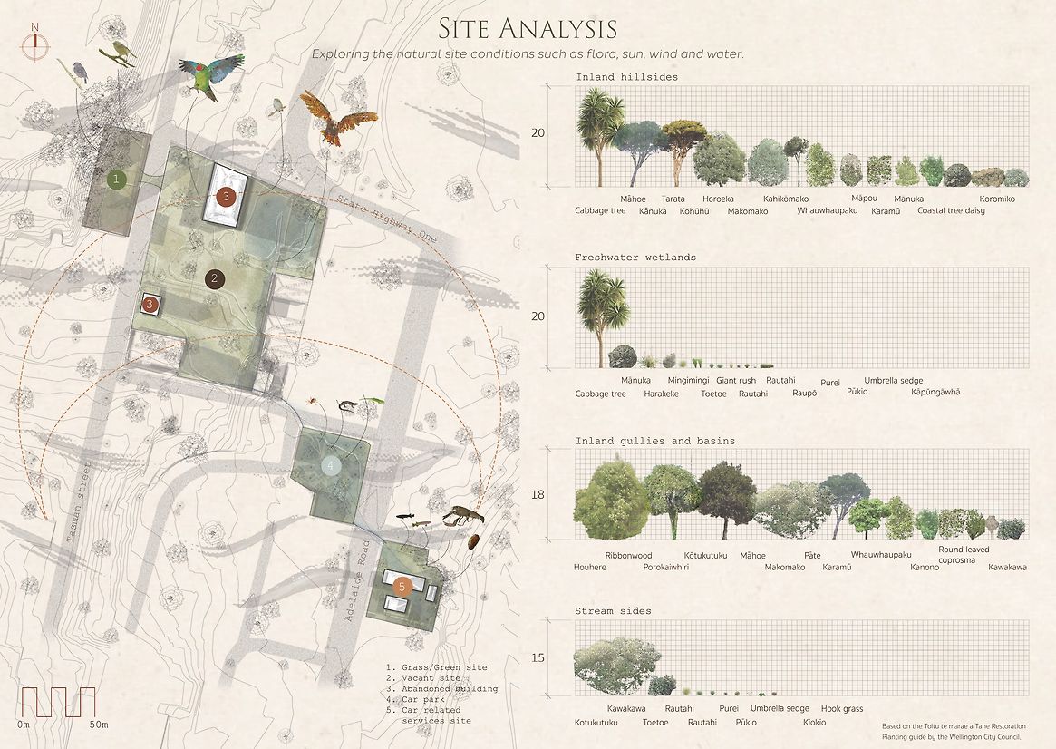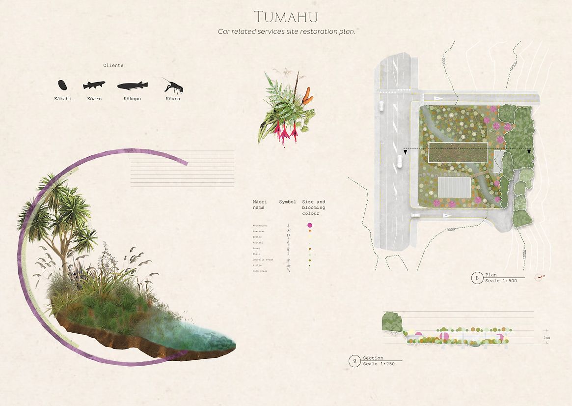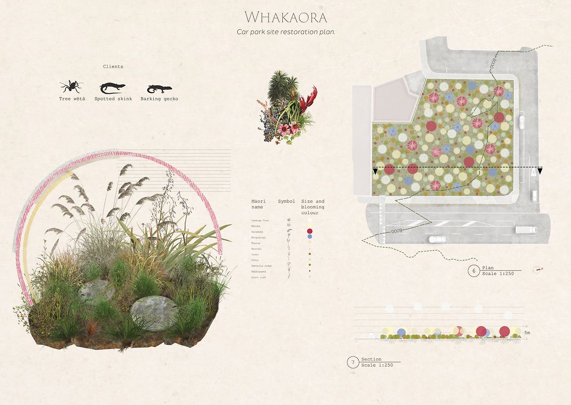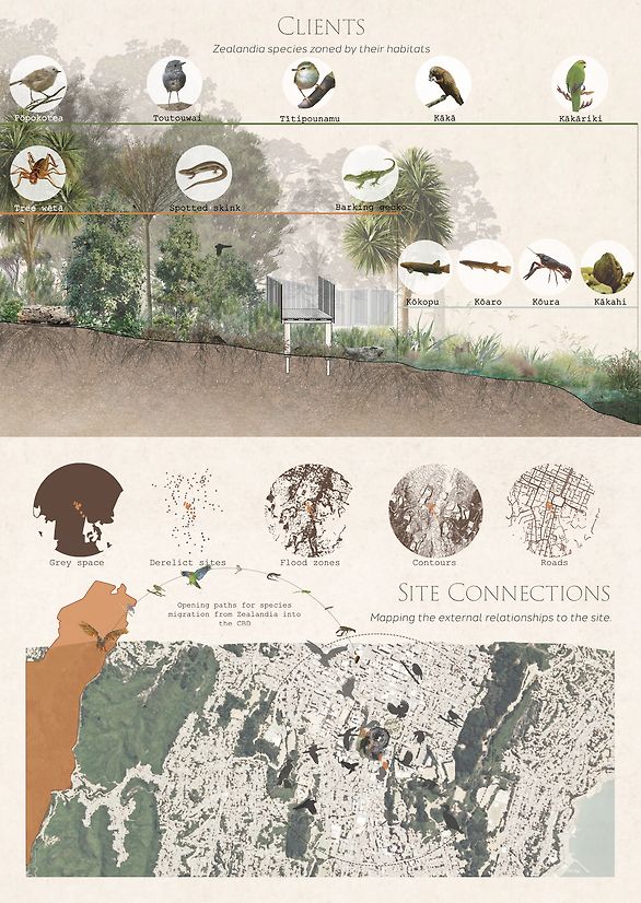 Eighty percent of Wellington CBD is comprised of grey space such as concrete, ash felt and other built structures. Within this area, the ‘derelict’ sites were identified based on their current mis-use or projected insignificance. This process identified four prevalent site categories: mono-cultured grass, car parking facilities, car-related services, and abandoned sites. Each site requires a unique adaptation strategy. The purpose, histories, and natural characteristics were analysed to create development timelines for the regeneration of these sites into native stepping stones. To illustrate the program’s wide ranging potential, four distinct central sites were selected to represent each category from the broader inventory. Each site has specific natural systems to consider when designing the ecological intervention, these include elevation, relief, sunlight, soil and wind direction. Every detail was considered in the design proposal for each site typology, including native plant species, human interaction opportunities, safe connection points between, species capabilities and project timelines. Humans are considered facilitators of the project while the design focuses primarily on the non-human clients, this was done by designing boundaries between human and non-human roles in the program. Through realistic renders and stop-motion GIFs, the designs are brought to life, visualising the spaces from the resident species’ perspectives. The timeline of the master project unfolds over a decade prompting natural growth in native greenspace and the ongoing success of The Wellington Predator-Free Program.