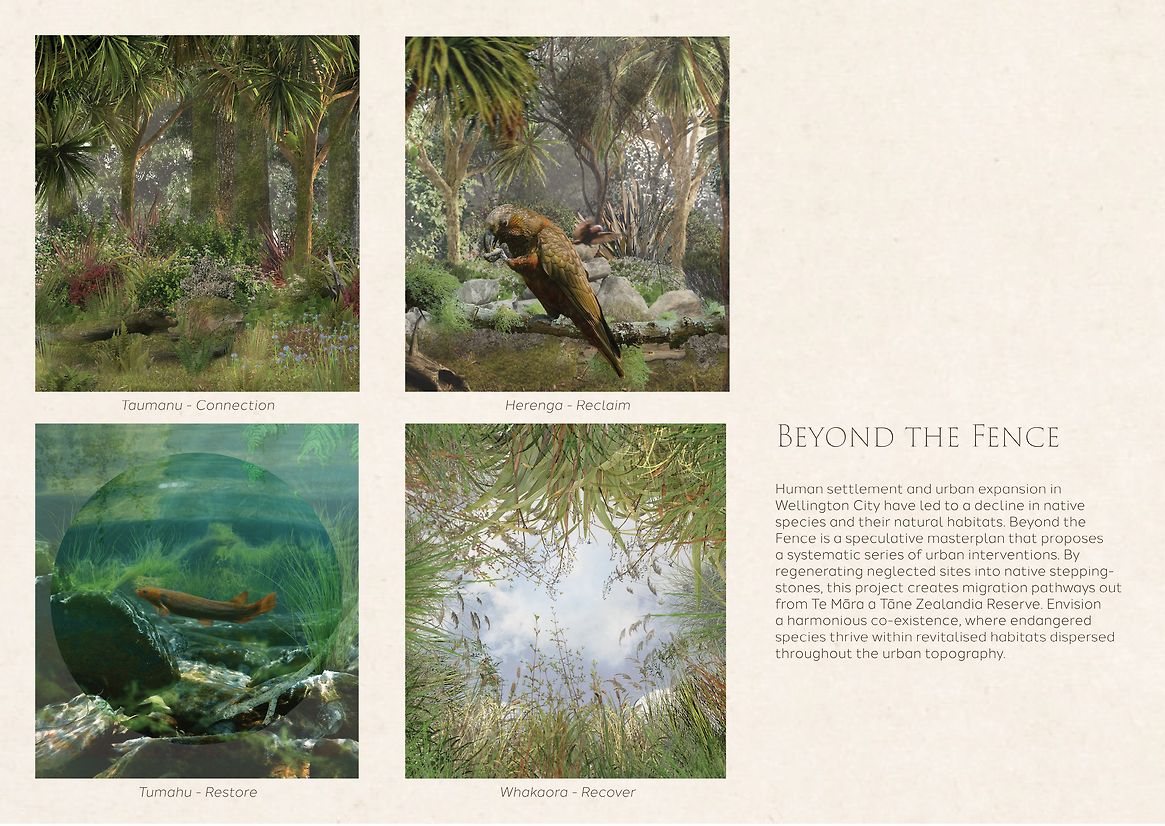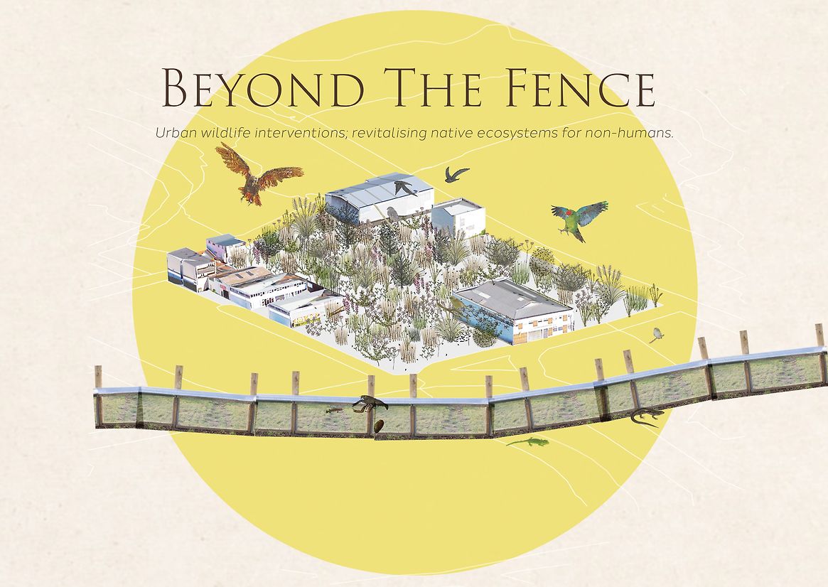 “Beyond the Fence '' proposes an ecological solution, in which derelict sites are regenerated into natural stepping-stones that aid in species migration and climate resiliency. Vital pathways are formed by weaving these habitats throughout central Wellington suburbs, extending to protected species in Zealandia. The regeneration process comprised three pivotal stages: identifying derelict underutilised urban spaces within the CBD for possible stepping stone sites; understanding the capabilities of the at-risk species and their natural habitats; and finally, crafting a detailed master plan for a strategised, city-wide design intervention.