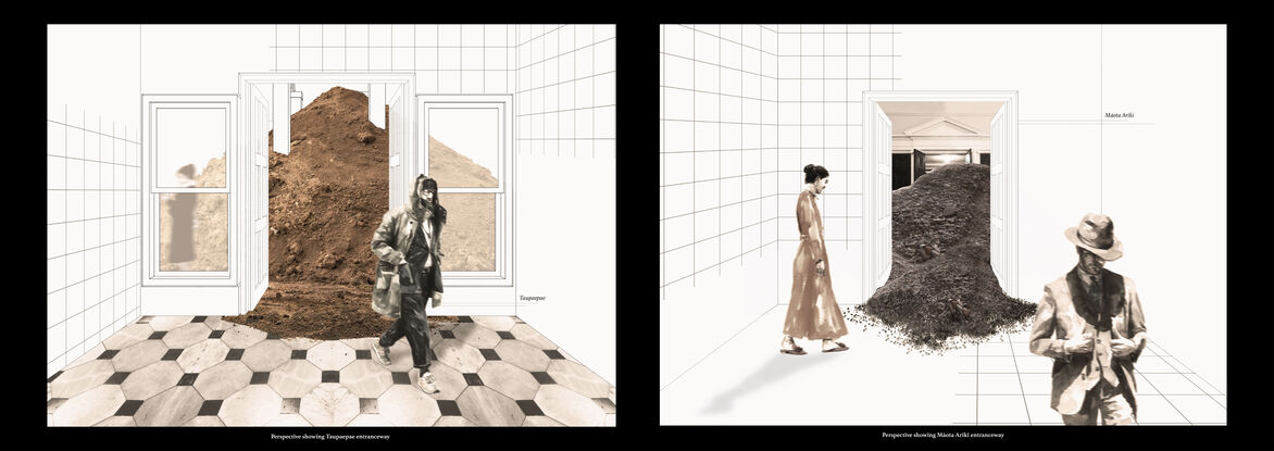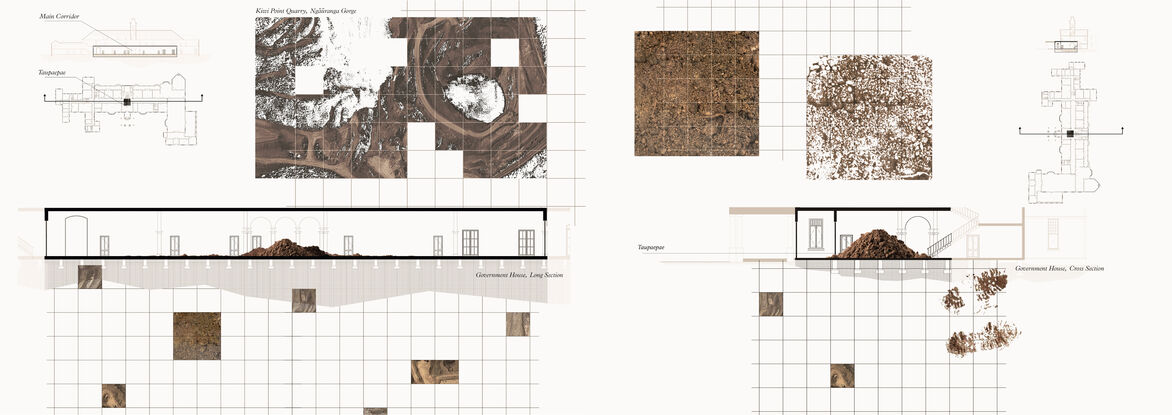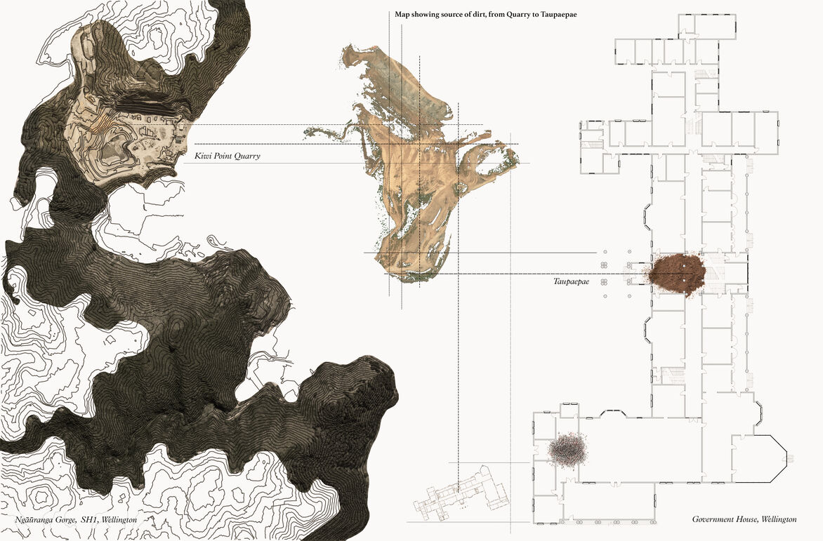 The intervention responds to two external sites of Māori significance in Te Whanganui-a-Tara: Ngāūranga Gorge and Ōwhiro Bay. Quarries at each of these sites have impacted the natural biodiversity of the land in various ways throughout the ongoing process of colonisation. The intervention consists of two piles of organic material waste in the main entrance ways of Government House. Organic material from Ngāūranga Gorge is placed in Taupaepae, and organic material from Ōwhiro Bay is placed in Māota Ariki. The earth in the intervention is a waste product of the quarries; the top layer they have to remove to get to the natural resources they wish to mine. This layer of soil is the skin of the land, performing vital functions within our ecosystem, necessary for all life on earth.