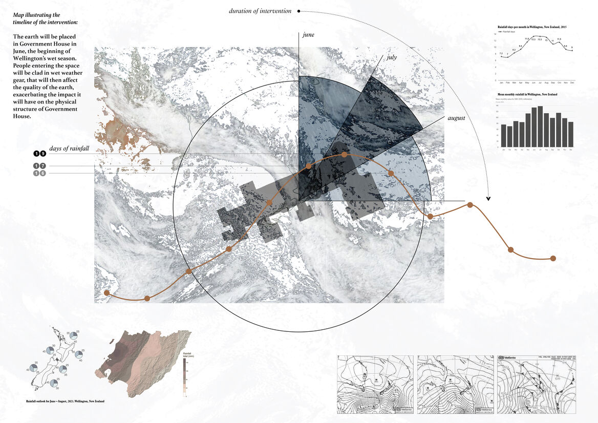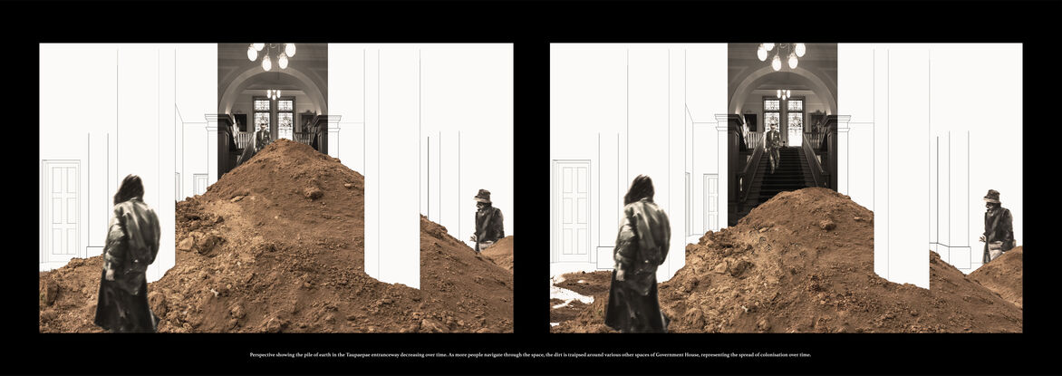 The intended audience for this intervention are people who often visit Government House, due to their jobs or status within society. As they arrive through the relevant entrance for their visit, they will be greeted by a large pile of earth. This initial pile of earth is representative of the initial colonisation of Aotearoa. As more people navigate through the space, the dirt is traipsed around various other spaces of Government House, representing the spread of colonisation over time. The space is intended to be difficult to navigate, to emulate the difficulty and discrimination marginalised cultures face within our westernised societal systems.