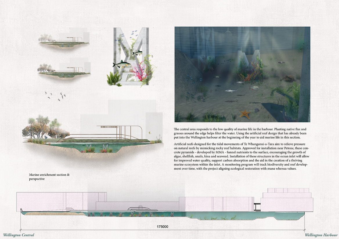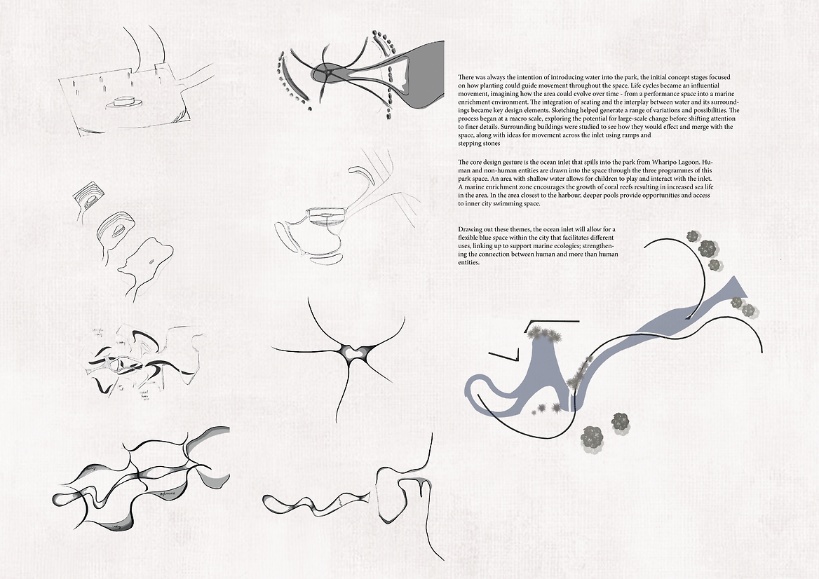 The core design gesture is the ocean inlet that spills into the park from Wharipo Lagoon. Human and non-human entities are drawn into the space through the three programmes of this park space. An area with shallow water allows for children to play and interact with the inlet. A marine enrichment zone encourages the growth of coral reefs resulting in increased sea life in the area. In the area closest to the harbour, deeper pools provide opportunities and access to inner city swimming space. The pathways extend out of the inlet to allow for easy access to the park. The seating, made from compressed soil, is designed to provide opportunities for lounging and sitting.