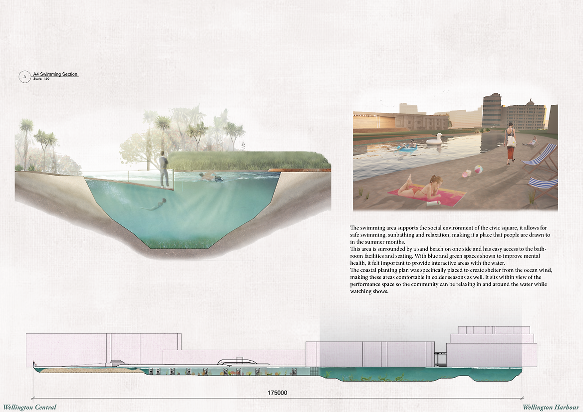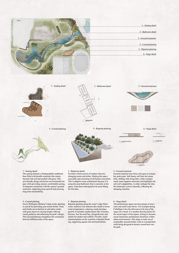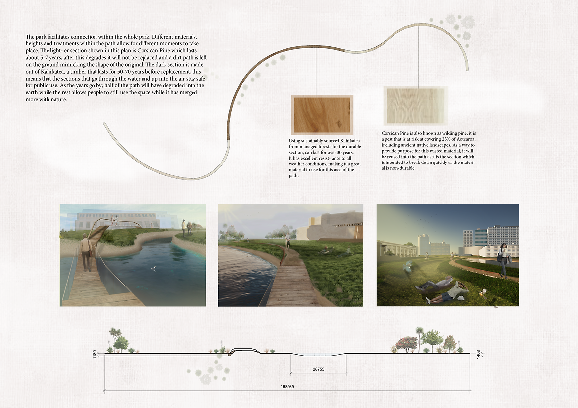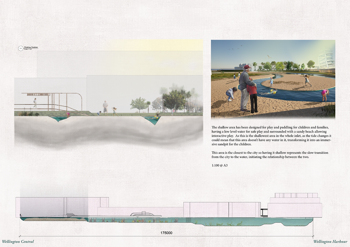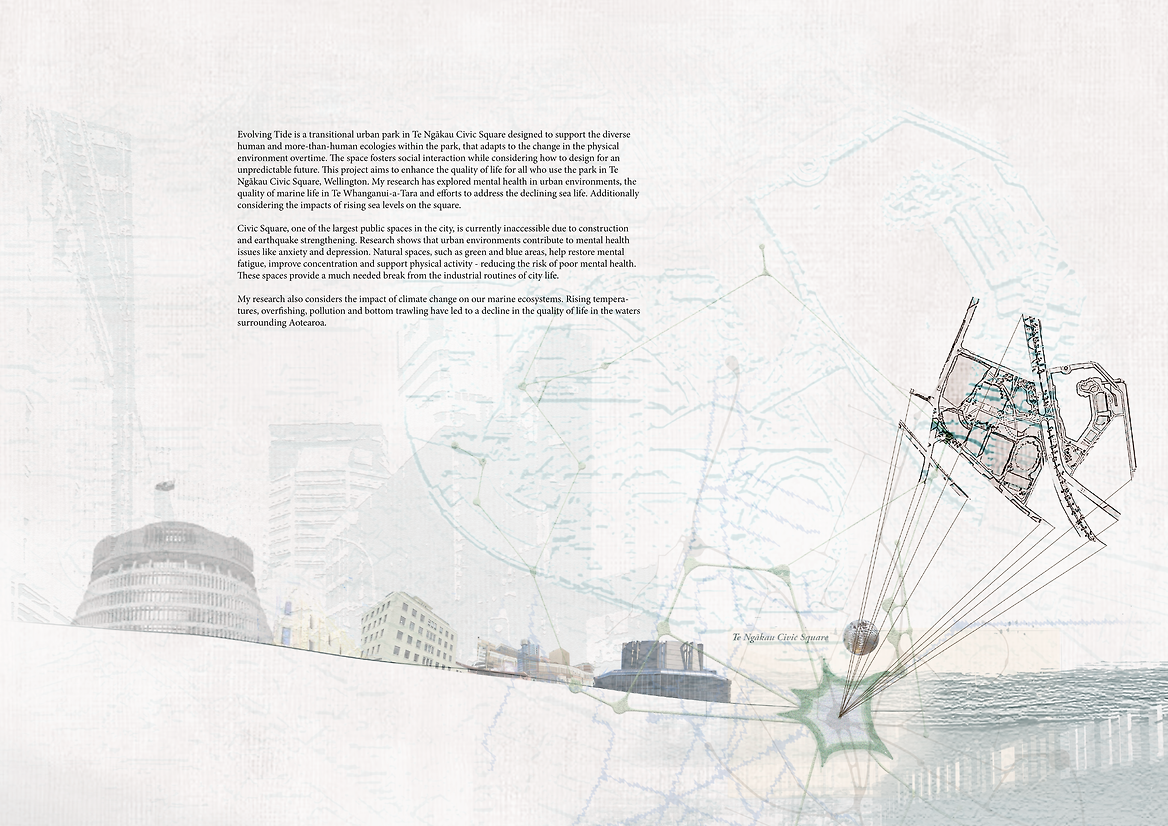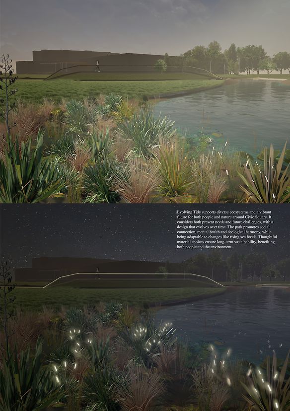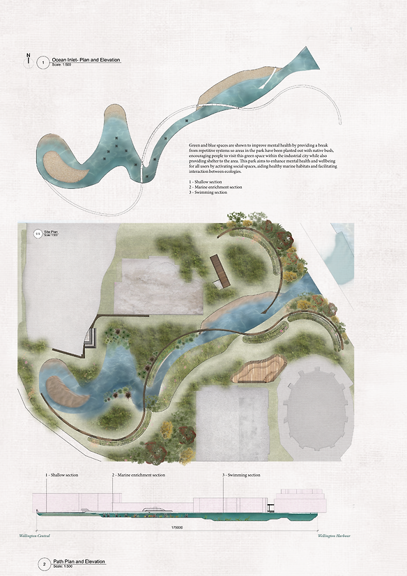 Evolving tide considers the intersection between ecological concerns and spaces that encore social well being. Respecting its current purpose while considering how that purpose may transition as time goes on. The space has been designed for people to use now while also thinking about how it will act in the future, so some selected materials have been chosen to allow for natural processes of decay, with some sections of the pathway deteriorating into the landscape overtime. The core design gesture is the ocean inlet that spills into the park from Wharipo Lagoon. Human and non-human entities are drawn into the space through the three programmes of this park space. An area with shallow water allows for children to play and interact with the inlet. A marine enrichment zone encourages the growth of coral reefs resulting in increased sea life in the area. In the area closest to the harbour, deeper pools provide opportunities and access to inner city swimming space. The pathways extend out of the inlet to allow for easy access to the park. The seating, made from compressed soil, is designed to provide opportunities for lounging and sitting. Green and blue spaces are shown to improve mental health by providing a break from repetitive systems so areas in the park have been planted out with native bush, encouraging people to visit this green space within the industrial city while also providing shelter to the area. This park aims to enhance mental health and wellbeing for all users by activating social spaces, aiding healthy marine habitats and facilitating interaction between ecologies.