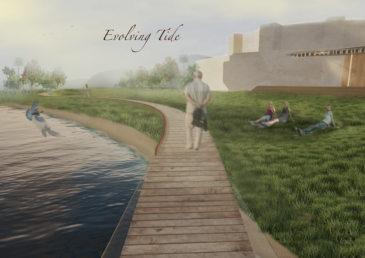 Evolving tide considers the intersection between ecological concerns and spaces that encore social well being. Respecting its current purpose while considering how that purpose may transition as time goes on. The space has been designed for people to use now while also thinking about how it will act in the future, so some selected materials have been chosen to allow for natural processes of decay, with some sections of the pathway deteriorating into the landscape overtime.