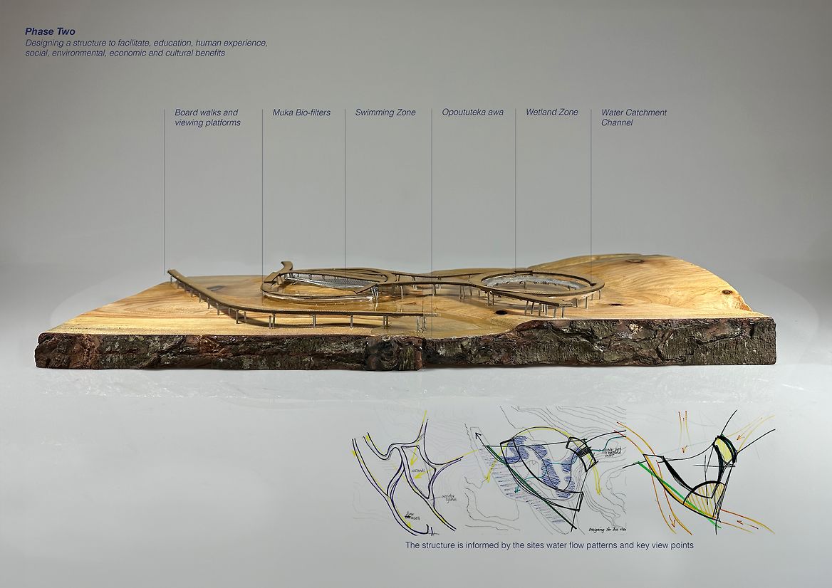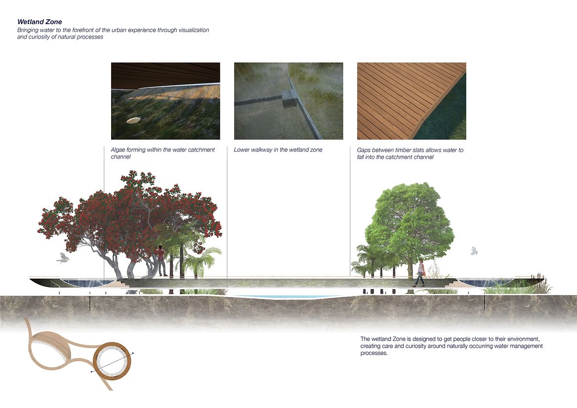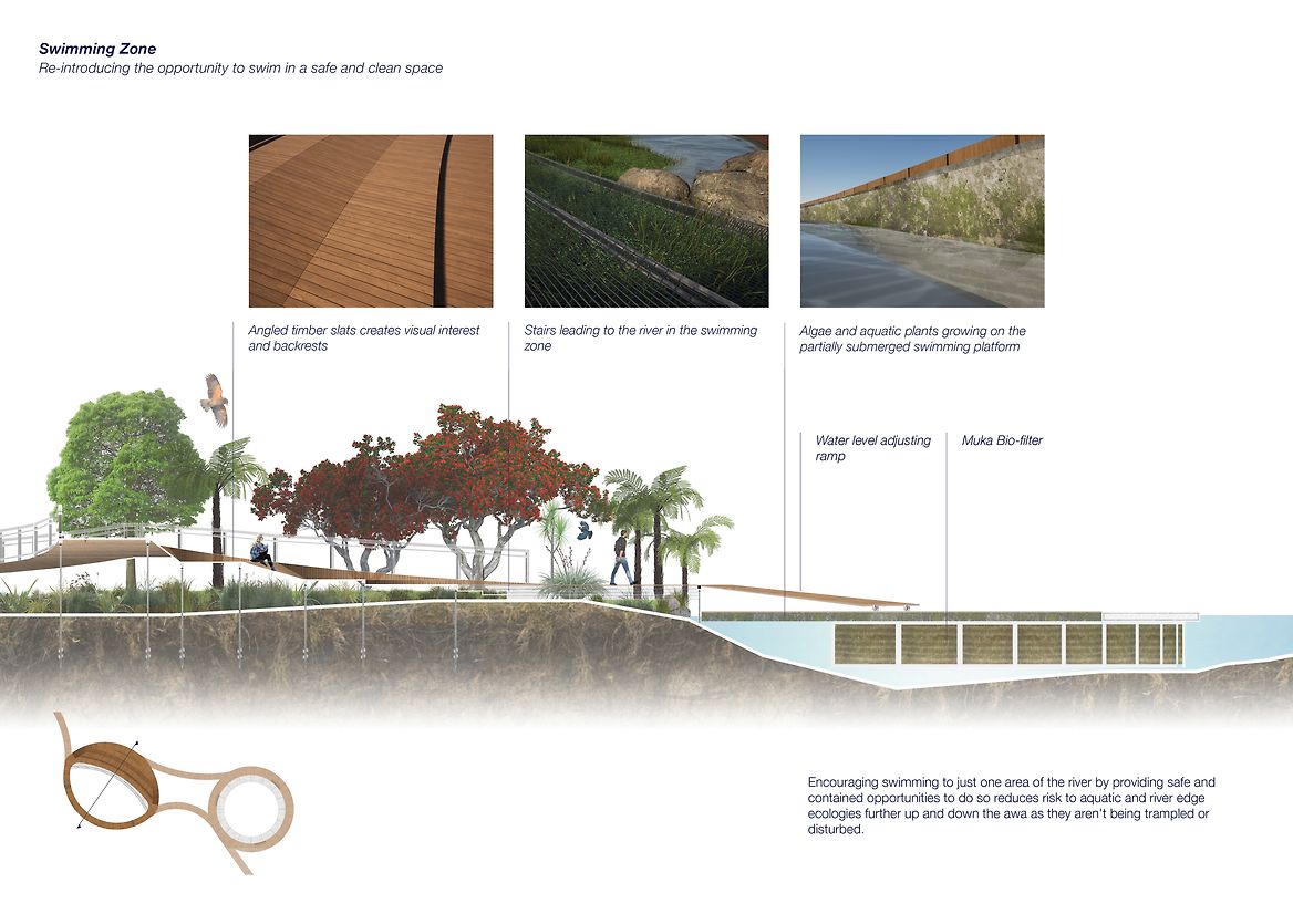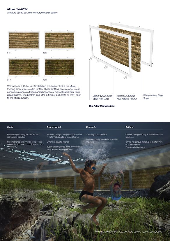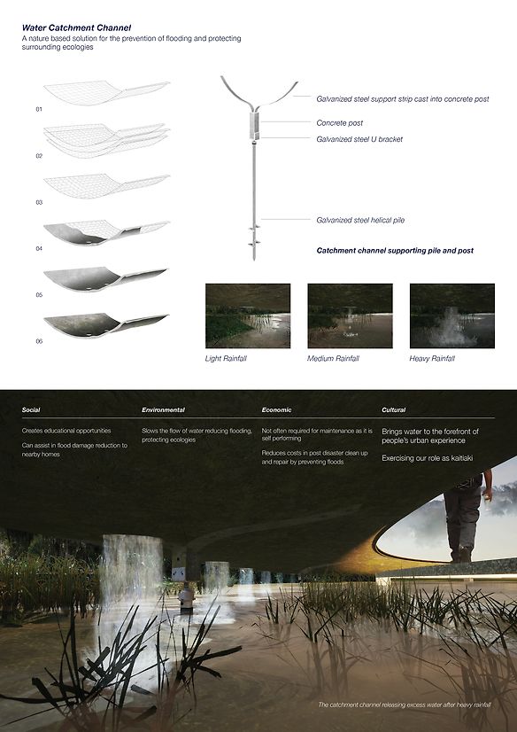 "Living with Water" is thoughtfully designed to benefit human and more-than-human wellbeing for harmonious coexistence centered around water. The structure consists of two main zones: the swimming zone to the northwest and the wetland zone to the southeast. Should this project progress further, I envision more areas of interaction and nature-based solutions being introduced within the boardwalk system. The structure integrates the four pillars of sustainability through each zone using various nature-based solutions. The swimming zone's floating platform has 20 muka biofilters attached underneath. Muka is harakeke fiber that has been used in many traditional Māori practices and once grew in large plantations within Grey Lynn Park. Local artists weave the sheets of muka, which are then installed between recycled plastic sheets and filter out pollutants from the water. The biofilters decompose over time, depending on water flow and speed. Once decomposed, they provide nutrients for the riverbed, and the frames can be removed and a new sheet installed. The wetland zone incorporates a water catchment channel to regulate the flow of water through the wetlands below, ensuring there is enough water to keep things moving and healthy, but not enough to overwhelm the natural processes. The channel is constructed directly above the wetland to reduce harm to surrounding environments by transporting materials from one location to another. As rain falls through the open timber slats above, it fills and biofilms form, beginning the filtration process. From here, water drips through 10mm holes into the wetland below, regulating the speed at which water enters the wetlands. Due to the chemical composition of the e-concrete channel, the structure can be broken down and recycled. Already cast sections could be repurposed along coastlines for strengthening. The circular structure of the wetland zone and its multi-layered walkways allow people to interact with the wetland at various heights and intimacy levels.