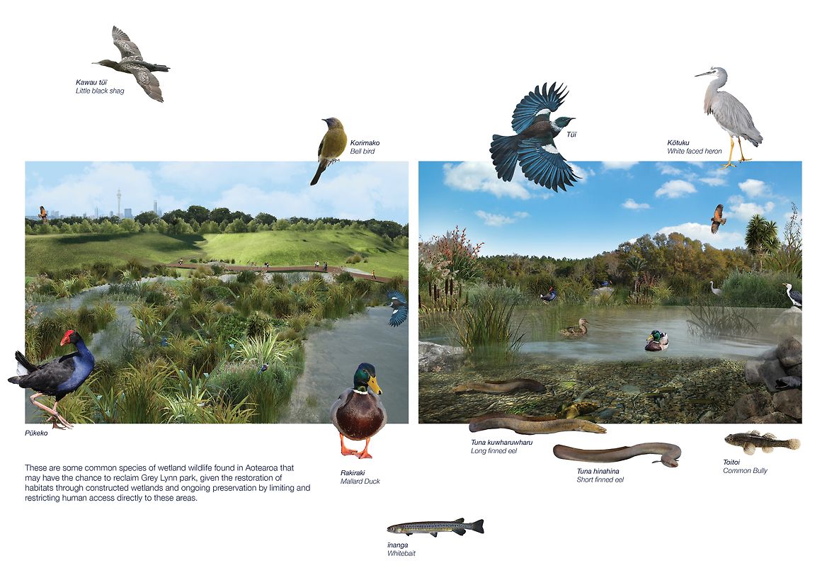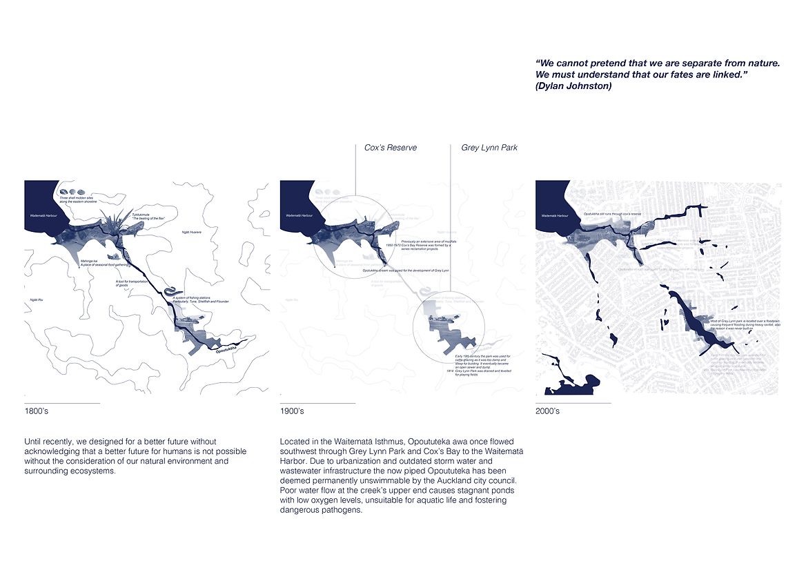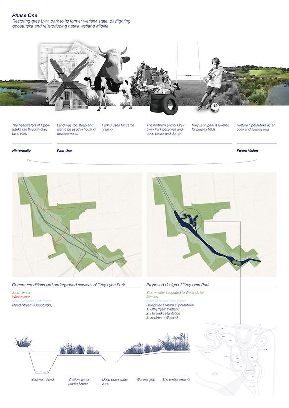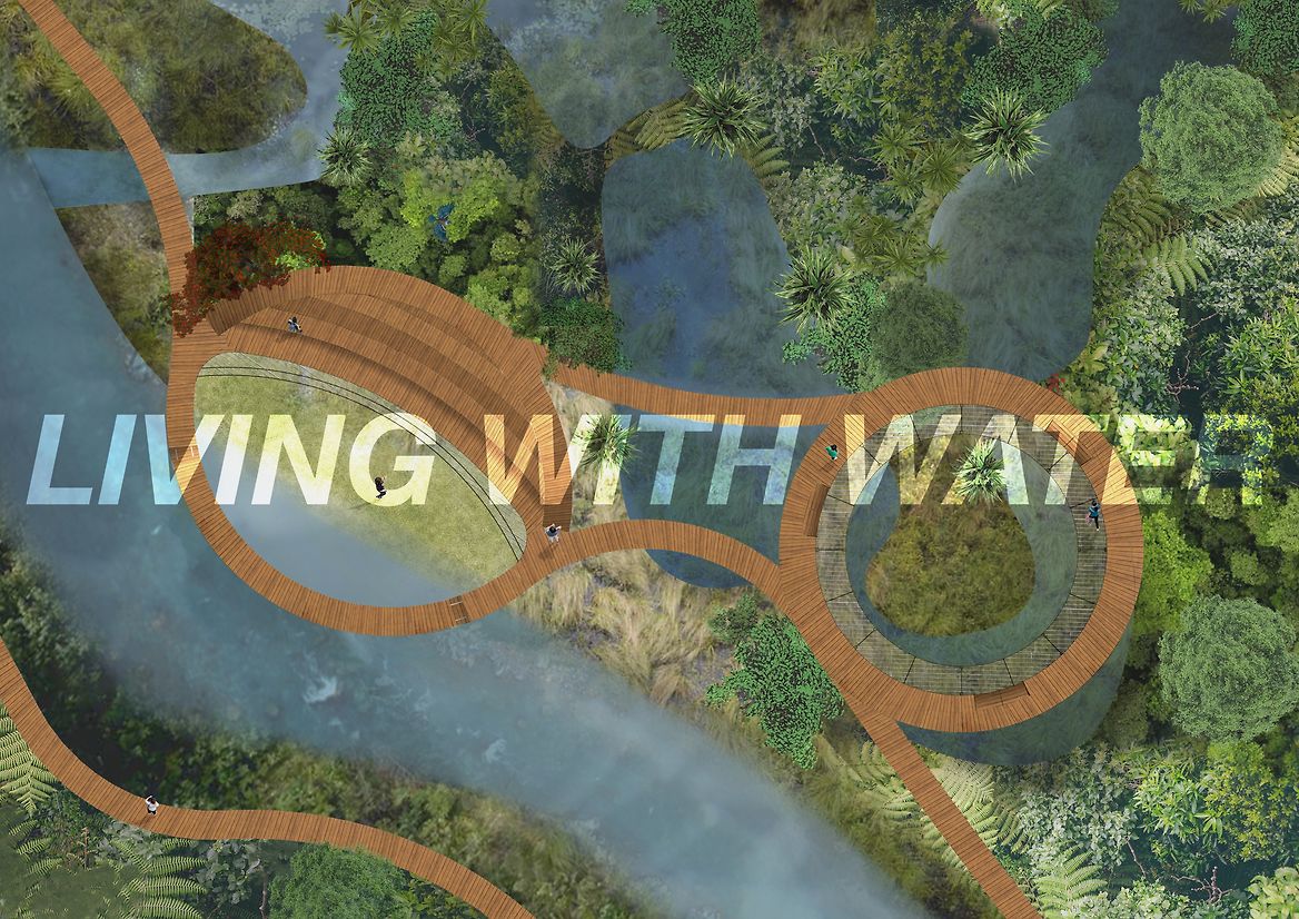 "Living with Water" is based in Grey Lynn Park, Tāmaki Makaurau, Aotearoa, one of the hardest-hit areas during the 2023 flooding. The Ōpoutūkeha Awa once ran through this area but has since been piped. Due to poor water disposal methods, the awa has become filled with polluted and foul-smelling sewage, making it permanently unswimmable alongside Coxs Bay Beach, where it empties into the harbor. "Living with Water" addresses this issue by reimagining Grey Lynn Park as a space where humans and more-than-human life can thrive. The park is designed as a purposefully floodable space. This project engages with water-sensitive design and nature-based solutions to reimagine Grey Lynn Park as a resilient public amenity. Through strategies of daylighting, constructed wetlands, and a built structure that encourages curiosity around natural water processes, it reintroduces swimming opportunities while protecting local ecologies.