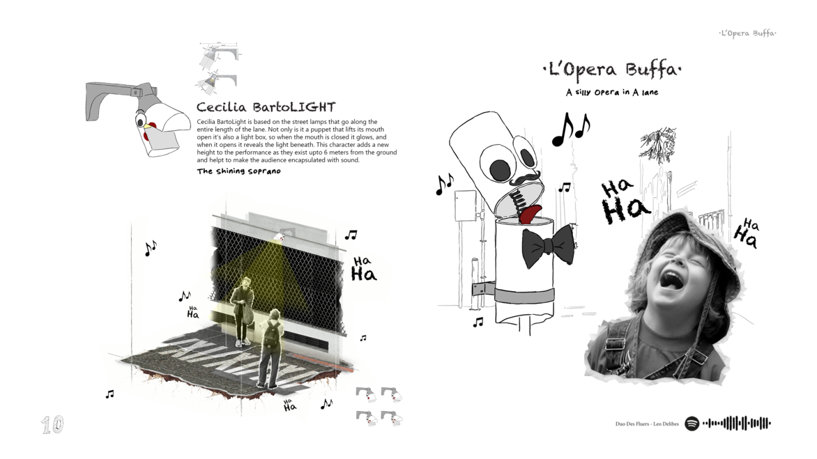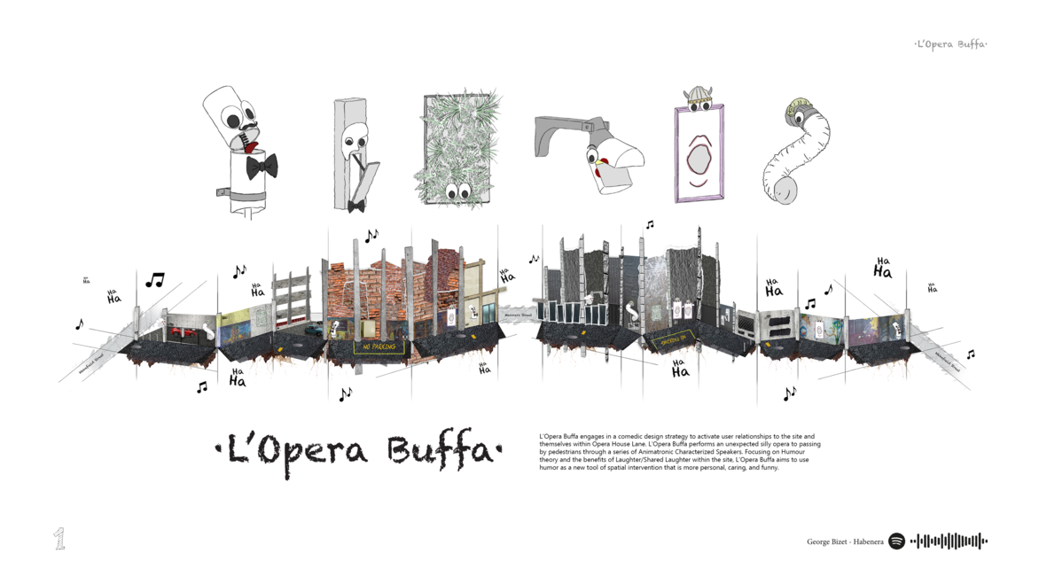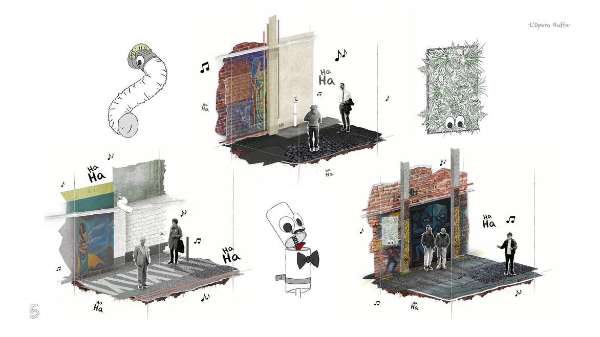 Opera House Lane is a difficult site to Activate. But L’Opera Buffa proposes an activation that responds to the physical site, by the nature of the design of the characters, to the opera House by performing a new opera and using that medium as its punchline. So instead of a dingy lane of manners it is an Opera for the people of Wellington physically performed as “the city of wellington.” A gem in the heart of the city.
